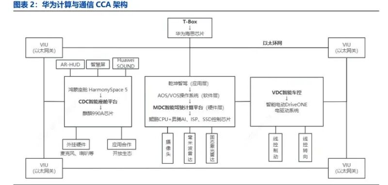 华为 CCA 架构未来向中央计算平台+区域接入+大带宽车载通信演进。华为CCA架构融合计算和通信技术,缩短整车开发周期,以尚界 H5 为例,研发周期从15个月减至 9 个月。通过区域控制器和以太环网构建车内通信网络,智能座舱域控制器CDC负责信息娱乐功能,智能驾驶域控制器 MDC 负责自动驾驶功能,整车控制VDC负责整车及底盘域的控制。