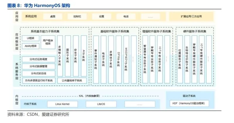 智能座舱由 L2 硬件参数竞争向智能底座 L3 演进。智能底座需融合长期记忆、自主决断与跨域联接能力,通过整合零散的感知、理解与执行单元,最终交付连贯、主动且专业的服务体验。华为基于人车关系提出座舱智能化五级标准,将座舱分为指令助手、任务助手、专业助理、专属助理、数字超人。 分布式操作系统为物联网跨设备协同的关键。IDC 预测2030 年全球物联网连接数将较 2024 年增长 10 倍以上,达到千亿级规模。HarmonyOS 操作系统基于微内核与分布式架构,具有低时延和模块化与弹性部署特征。系统跨设备、跨域调度,将座舱从单机系统升级为车内+车外分布式系统。系统通过软总线实现多设备能力虚拟化与信息同步,缓解传统操作系统的设备异构、开发成本高及体验割裂的问题,以用户意图为中心,生态从封闭转向开源共建。HarmonyOS 遵从分层设计,包括:内核层、系统服务层、框架层和应用层。系统功能按照系统>子系统>功能/模块逐级展开,多设备部署时根据实际需求裁剪非必要模块,构建 1+8+N 互联互通鸿蒙终端生态。