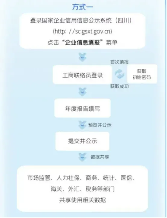 方式一:通过国家企业信用信息公示系统,点击“企业信息填报”菜单,进去后选你所在的省市,然后填报年度报告并公示。