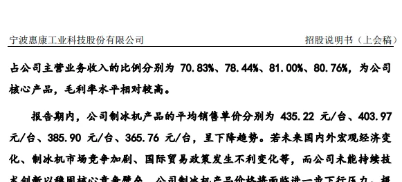 为了维持市场份额和增长叙事,惠康科技似乎陷入了“以价换量”的被动局面。其核心产品制冰机的平均销售单价已从2022年的435.22元/台,连续下滑至2025年上半年的365.76元/台,累计降幅达12.69%。招股书坦承,若单价再下降5%,将导致主营业务毛利率下滑3.22个百分点。价格战侵蚀利润空间,这是其增长故事中难以忽视的暗面。