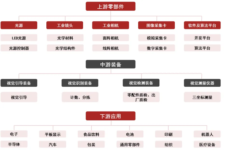 机器视觉产业链可分为上游软硬件、中游制造、下游应用。