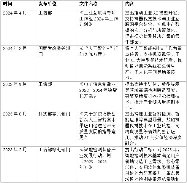 近年来,随着我国制造业以及人工智能、物联网等新兴技术产业的发展,我国制造业逐渐向高端化及智能化发展转型。智能制造装备行业对于制造业生产的效率及精准度都有着较为严格的要求,机器视觉软硬件产品作为智能制造的关键技术,长期以来受到国家各项政策的大力鼓励和支持。我国机器视觉行业近年主要相关政策如下: