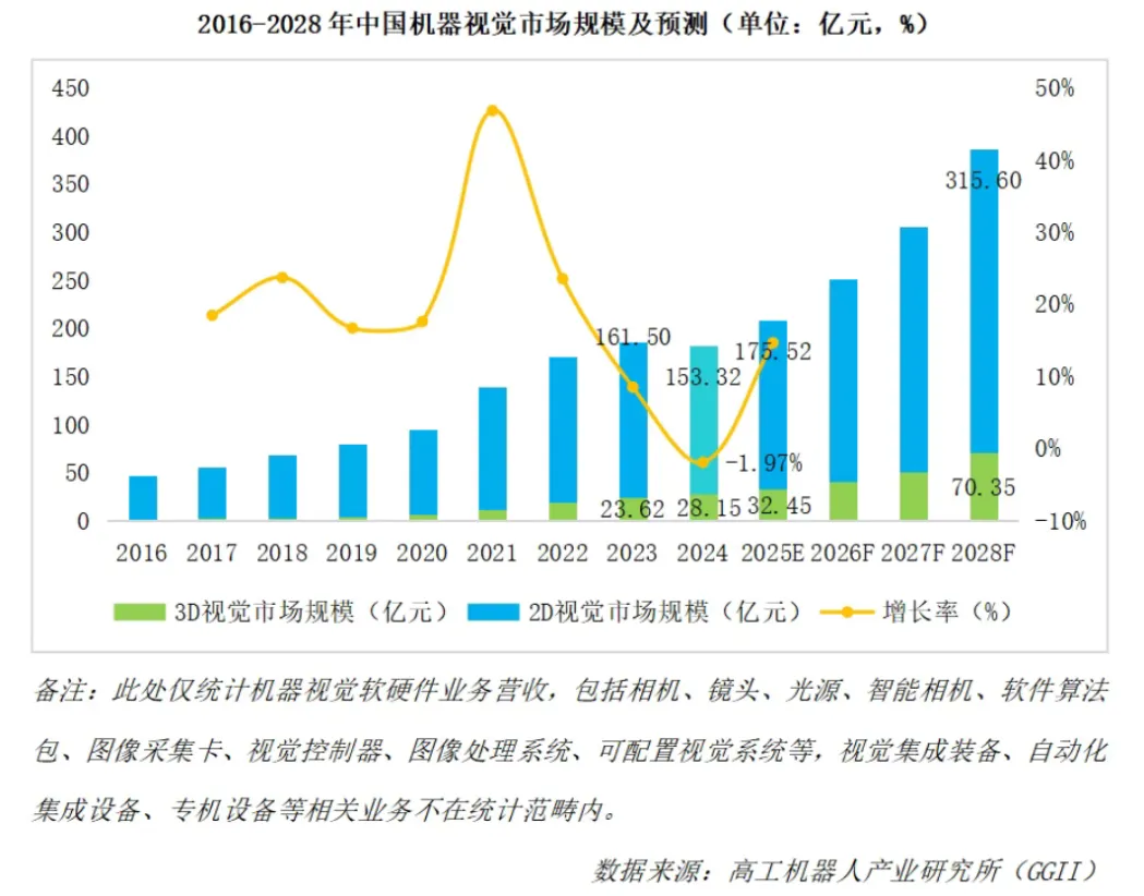 GGII 预测,2025年中国机器视觉市场规模有望突破210亿元,同比增速超14%,基于对外部环境的不确定性与产业投资谨慎度上升的判断,GGII整体调低了未来几年机器视觉市场的增速预期,预计至2028年我国机器视觉市场规模将超过385亿元,2024-2028年复合增长率约为20%。其中2D视觉市场规模将达到315亿元,2024-2028年复合增长率为19.78%。3D视觉市场规模约为70亿元,2024-2028年复合增长率约为25.73%。