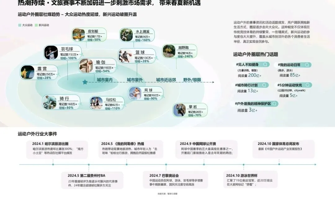 1. 圈层热潮持续:大众运动(羽毛球、篮球、瑜伽)热度延续,新兴运动(溯溪、皮划艇、越野跑)爆发式增长,覆盖城市室内、近郊、野外全场景,全民参与度提升。