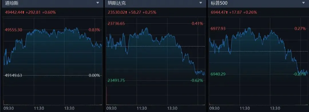 美东时间周四,美股三大指数集体收涨,道指上涨292.81点(0.60%)报49442.44点,纳指涨58.27点(0.25%)报23530.02点,标普500指数涨17.87点(0.26%)报6944.47点。核心驱动力来自台积电,其公布创纪录季度业绩,利润同比增长35%,股价收高4.5%,带动美光科技、英伟达等芯片股及应用材料等供应商普涨。热门中概股呈现分化,纳斯达克中国金龙指数跌0.6%,多数个股下跌,仅阿里及部分新能源车企逆势上涨。