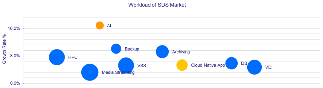 从应用场景来看,不同领域的SDS市场增速呈现显著分化:在高性能计算(HPC)领域,SDS市场以7.6%的增速稳步前行;而人工智能(AI)领域则成为最引人注目的增长引擎,其SDS市场增速高达16.8%,居各应用场景之首,正成为推动行业发展的关键驱动力。