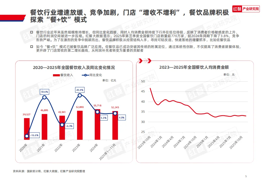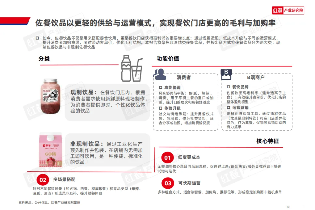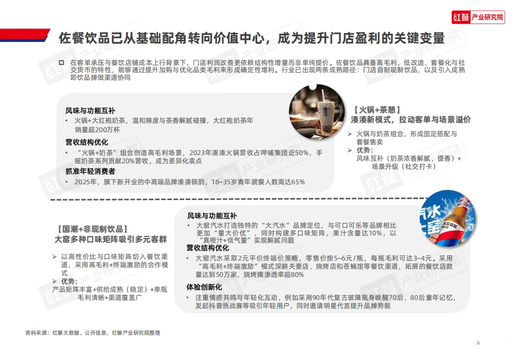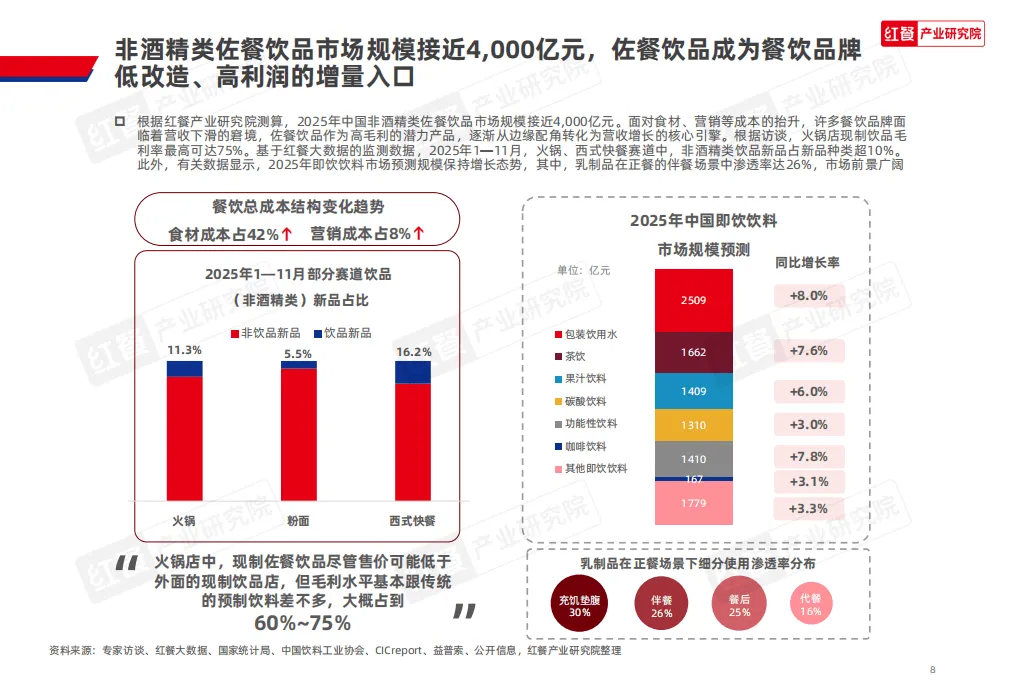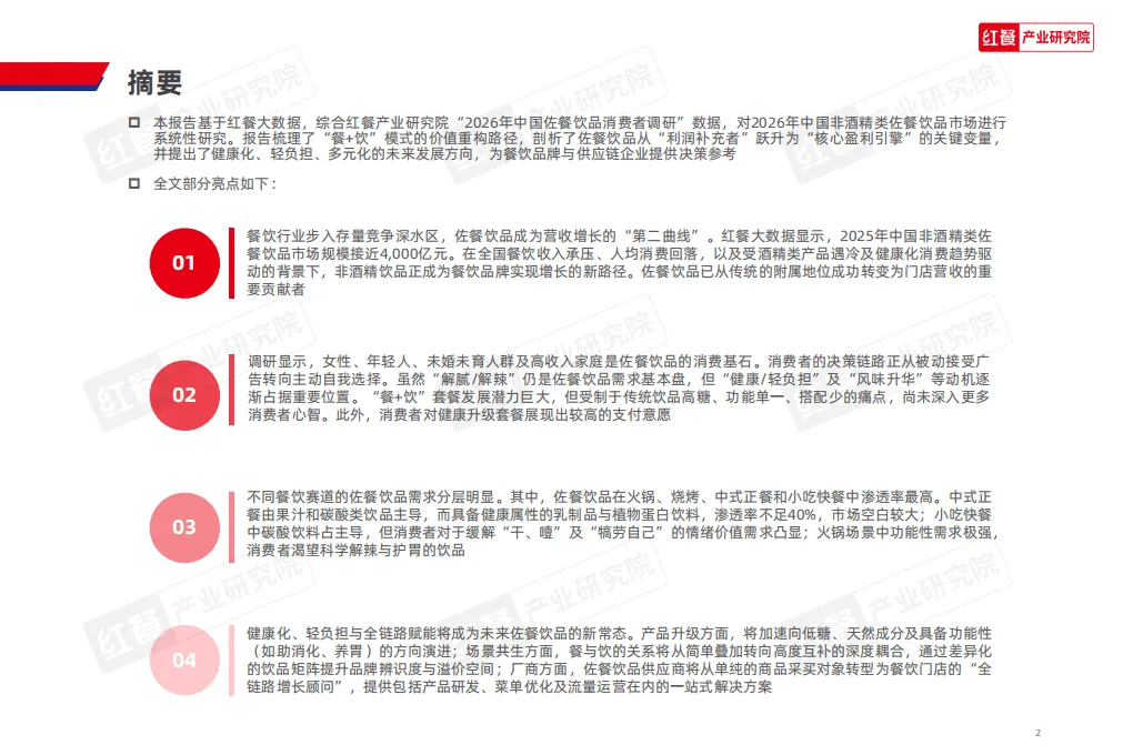 2026年红餐产业研究院发布的报告显示,中国餐饮行业步入存量竞争阶段,非酒精类佐餐饮品已从餐桌附属品升级为门店营收增长的“第二曲线”,2025年市场规模接近4000亿元。在餐饮收入承压、酒精类产品遇冷及健康消费趋势驱动下,佐餐饮品成为餐饮品牌实现增长的重要路径,完成了从利润补充者到核心贡献者的转变。