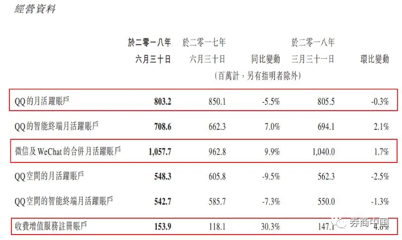 值得注意的是,年龄为21岁或以下用户的QQ智能终端月活跃账户及日活跃账户均实现两位数的同比增长。QQ看点(QQ的内置新闻信息流服务)优化了短视频及小视频的推荐算法,推动日视频播放量环比增长逾一倍。