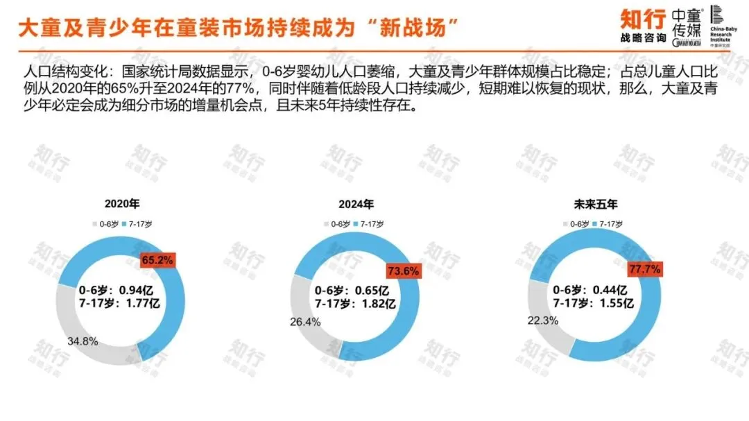 报告基于详实的人口预测数据,揭示了童装市场面临的根本性变化。数据显示,0-6岁婴幼儿及小童人口正经历急剧下滑,而7-17岁的大童及青少年群体规模相对稳定,占总儿童人口比例已从2020年的65%攀升至2024年的77%。这意味着,未来童装市场的增量将主要来自大童及青少年群体,该赛道兼具短期红利与长期布局价值。