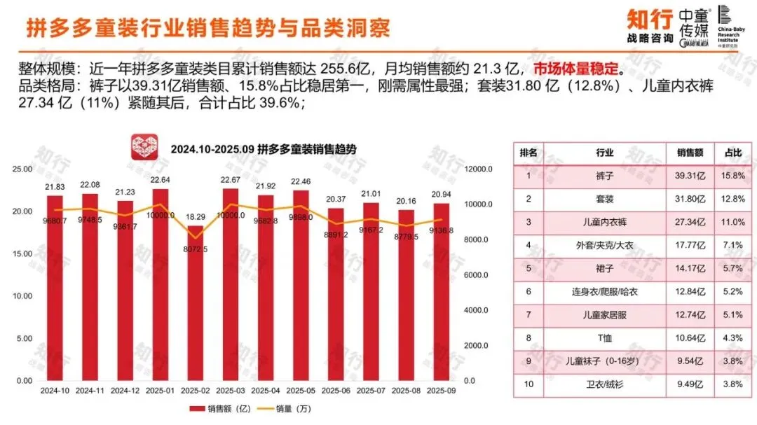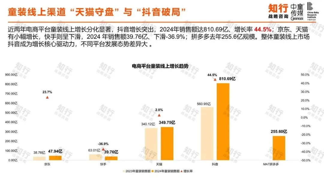 线上渠道是童装销售的核心阵地,且平台格局分化明显。报告显示,儿童服饰在淘宝和抖音均是婴童用品中的绝对核心品类,销售额规模庞大。近两年,抖音增长尤为突出,2024年童装销售额达810.69亿元,同比增长44.5%,成为行业增长的核心驱动力。天猫、京东保持稳定,而快手则出现下滑。拼多多则以255.6亿元的年销售额,展现出稳定的市场体量。