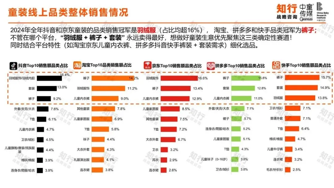 报告对各主流电商平台的销售品类进行了细致分析。一个清晰的结论是:羽绒服、裤子和套装是跨平台的畅销品类。在抖音和京东,羽绒服是销售额占比最高的品类;在淘宝、拼多多和快手,裤子则位居第一。这表明,无论渠道如何变化,满足基础保暖和穿着需求的品类始终拥有最稳定的基本盘,是商家应优先聚焦的确定性赛道。