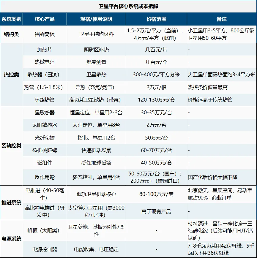 热控系统用于卫星控温,包含加热片、热敏电阻、散热器、热管等产品。加热片用于阴影区补热,价格几百块/片;热敏电阻用于测量温度,价格几百块;散热器分白漆、黑漆,白漆价格300~400块/平方分米,大卫星一个面散热面约3-4平方米;热管用于导热(内部充液体氮气或氨气),1.5~1.8米长的热管价格2万元/根,是热控类价值量最高的产品。