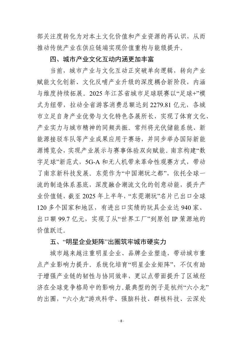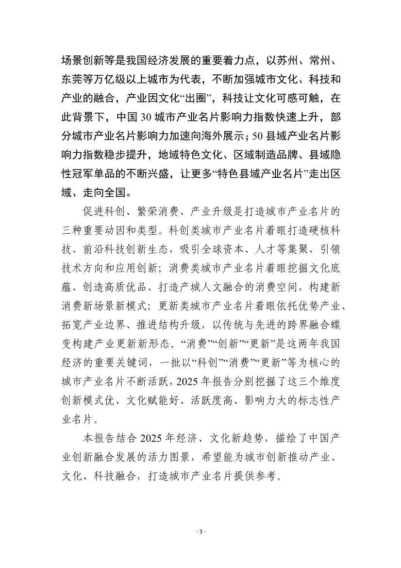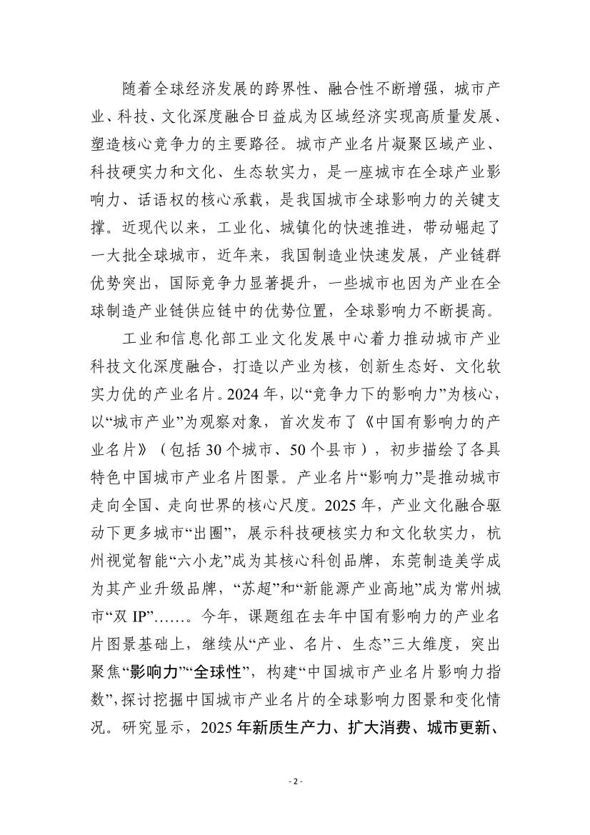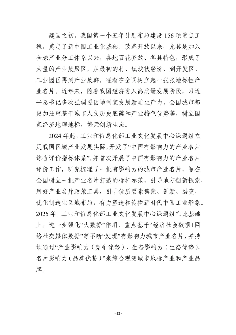 《2025中国有影响力的产业名片》深度解读:产业、文化、科技融合的城市竞争新范式这份由工信部工业文化发展中心发布的报告,勾勒出一幅中国城市产业竞争的全新图景:产业名片已从简单的"产业标签"升级为城市硬实力与软实力的综合载体,成为城市在全球产业体系中争夺话语权的核心工具。2025年的核心逻辑是"竞争力下的影响力"——产业实力是基础,但能否转化为可感知、可传播、可沉淀的城市品牌,才是决胜未来的关键。报告开篇即点明,产业名片是区域产业、科技硬实力和文化、生态软实力的凝聚体,是城市全球影响力的核心支撑。这与传统意义上的"产业集群"有本质区别:产业集群强调企业集聚和供应链效率,而产业名片更注重产业形象的文化性表达和全球传播力。2025年呈现六大新趋势,揭示了产业名片塑造逻辑的深层变革:全球城市实践显示,文化与科技融合已从"催化剂"进阶为"新土壤"。 奥地利林茨从钢铁重镇转型AI枢纽,核心在于构建艺术、技术与传统产业共生的生态系统;柏林通过"MAKE IT HERE"计划推动"制造复兴",用激光切割机等智能工具赋能小型制造者。这些案例表明,产业名片不是靠历史遗产坐享其成,而是主动构建涵盖质量控制、技术创新、品牌叙事与营销的整体生态,让"地名"真正成为"名品"的保证。先行城市通过塑造科创形象抢占新赛道。 苏州对标波士顿经验,用十年打造"中国药谷";杭州发布全国首个数字经济产业知识产权专项规划,重塑"数字经济第一城";上海出台脑机接口未来产业培育行动方案。这些城市不再满足于产业规模的简单扩张,而是通过政策、平台、人才与产业的深度耦合,在AI、量子信息、生物医药等前沿领域预埋影响力种子。特色消费成为驱动产业升级的新引擎。 成都凭借《哪吒2》成为"哪吒之城",文创产业增加值突破2800亿元;景德镇千年瓷都激活"新国潮",2025年陶瓷产值首破900亿元;太原借"演唱会经济"探索从"煤都"到区域消费枢纽的转型。消费不再是产业的附属,而是通过文化挖掘、场景创造和模式创新,反向拉动产业链价值重构。城市产业文化互动内涵更加丰富。 2025年江苏城市足球联赛拉动全省游客消费2279亿元,常州将光伏储能应用于赛场并同步举办国际新能源博览会,南京用5G-A和无人机重构观赛方式。产业、文化、体育边界消融,形成"体育文化-产业实力-城市精神"的同频共振。"明星企业矩阵"出圈筑牢城市硬实力。 杭州"六小龙"(游戏科学、强脑科技、宇树科技等)在视觉智能、机器人领域集体爆发,深圳南山"八大金刚"机器人企业崛起。这些矩阵式企业集群通过技术引领、资本集聚与品牌输出,形成"一个有影响力企业带动一个产业名片"的乘数效应。制造业区域品牌塑造地域制造名品。 工信部首批43个区域品牌显示,从涪陵榨菜、柳州螺蛳粉到威海钓具、景德镇陶瓷,区域品牌正从单纯地名标识升级为品质、技术、信誉和文化的综合载体。指标维度上,构建"产业影响力-名片影响力-生态影响力"三位一体框架。 产业影响力聚焦规模优势、龙头企业、主导产品、技术专利和集群能级;名片影响力测评品牌标识、媒体正面报道、搜索热度和社交媒体传播力;生态影响力评估人才、创新、金融要素集聚和产业协作网络。相比2024年,新增政府主导产业基金、产业关键词搜索热度等大数据指标,强化对动态创新能力的捕捉。评价方法上,采用德尔菲法与蒙特卡罗模拟结合。 通过多轮专家征询确定权重,用蒙特卡罗模拟检验权重稳定性,确保不因专家打分微小波动导致结果失真。这种方法体现了"客观数据为主、专家经验为辅"的科学精神,也反映出产业名片评价从主观定性向精确定量的演进。数据来源上,经济社会数据与网络社交媒体数据融合。 产业关键词搜索热度、社交平台互动率、双创活动曝光量等实时数据被纳入,使评价不再依赖静态统计报表,而能捕捉产业在公众视野中的真实"声量"。三、2025年产业名片全景:头部固化与县域突围并存30个有影响力的城市产业名片中,83%来自GDP30强市,呈现强者恒强的"马太效应"。北京(数字经济)、上海(高端制造)、深圳(信息通信)构成第一梯队,产业影响力指数在0.85以上,其核心竞争力在于原创技术研发和全球标准制定。苏州(生物医药)、杭州(视觉智能)、武汉(光电子)等新一线城市表现亮眼,产业影响力介于0.75-0.85之间。这些企业凭借"单品突破+集群成势"路径,在细分领域建立全国性优势。例如苏州生物医药产业综合竞争力全国第一方阵,杭州视觉智能产业规模突破5000亿元。分项特征揭示深层逻辑:产业竞争力与生态影响力相关系数高达0.926,说明产业强则生态优,二者形成正向循环。但传播影响力相对独立,与产业、生态的相关系数仅0.531和0.679,表明传播效果不完全依赖硬实力,品牌策略和文化叙事能显著放大影响力。景德镇陶瓷产业影响力指数0.7403,传播力超越部分产业实力更强的城市,印证了"文化赋能"的杠杆效应。50个县域产业名片呈现"头部聚集、尾部追赶"特征。昆山(笔记本电脑)、晋江(国潮鞋服)、常熟(秋冬服装)等头部强县综合影响力指数超过0.78,已形成完整的产业链和集群优势。其中昆山指数达0.8646,接近地级市水平,其笔记本电脑制造构建了从核心部件到组装销售的完整生态。县域突围的核心密码是"特色+传播"。德化白瓷、曹县汉服、安溪乌龙茶等
