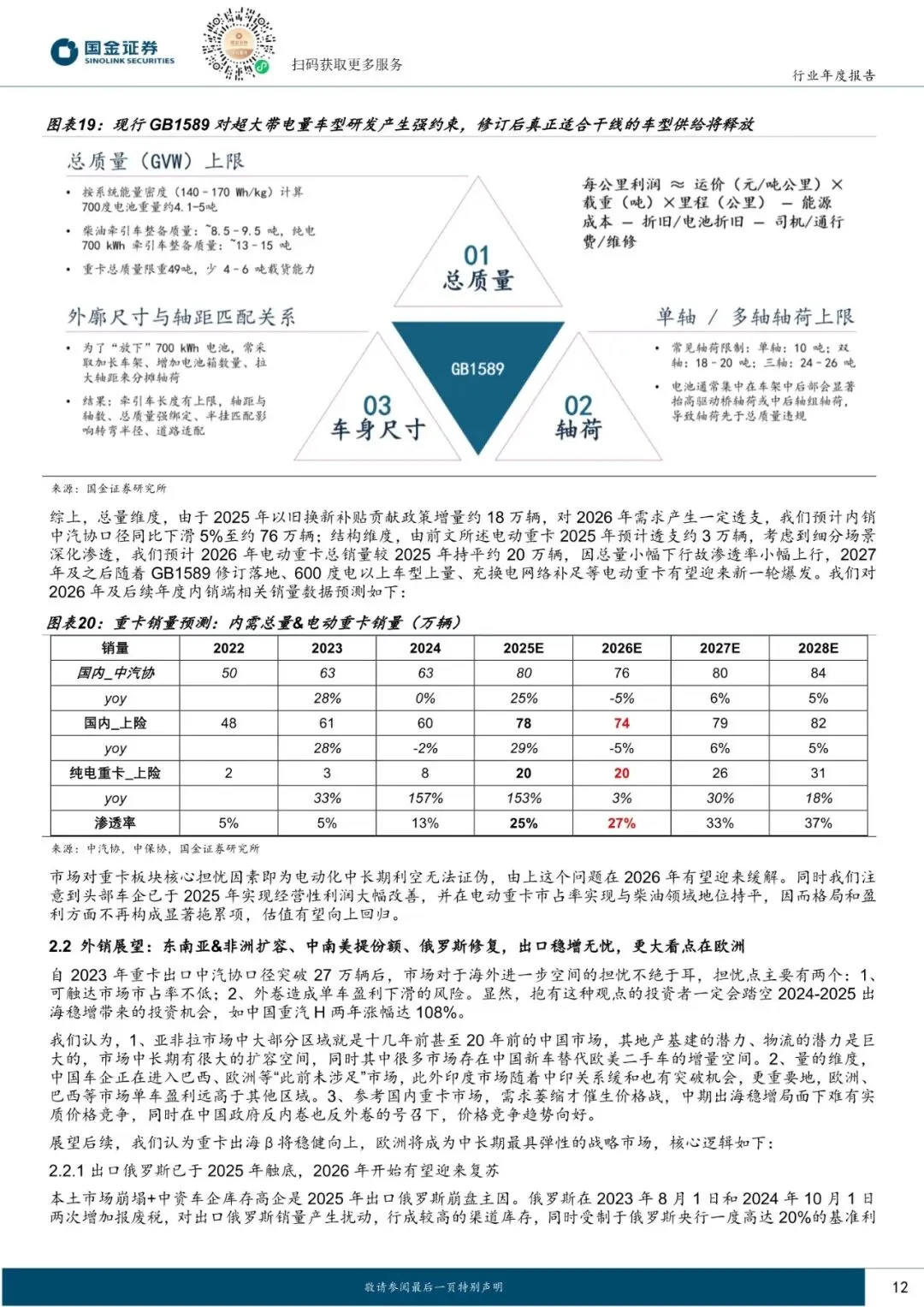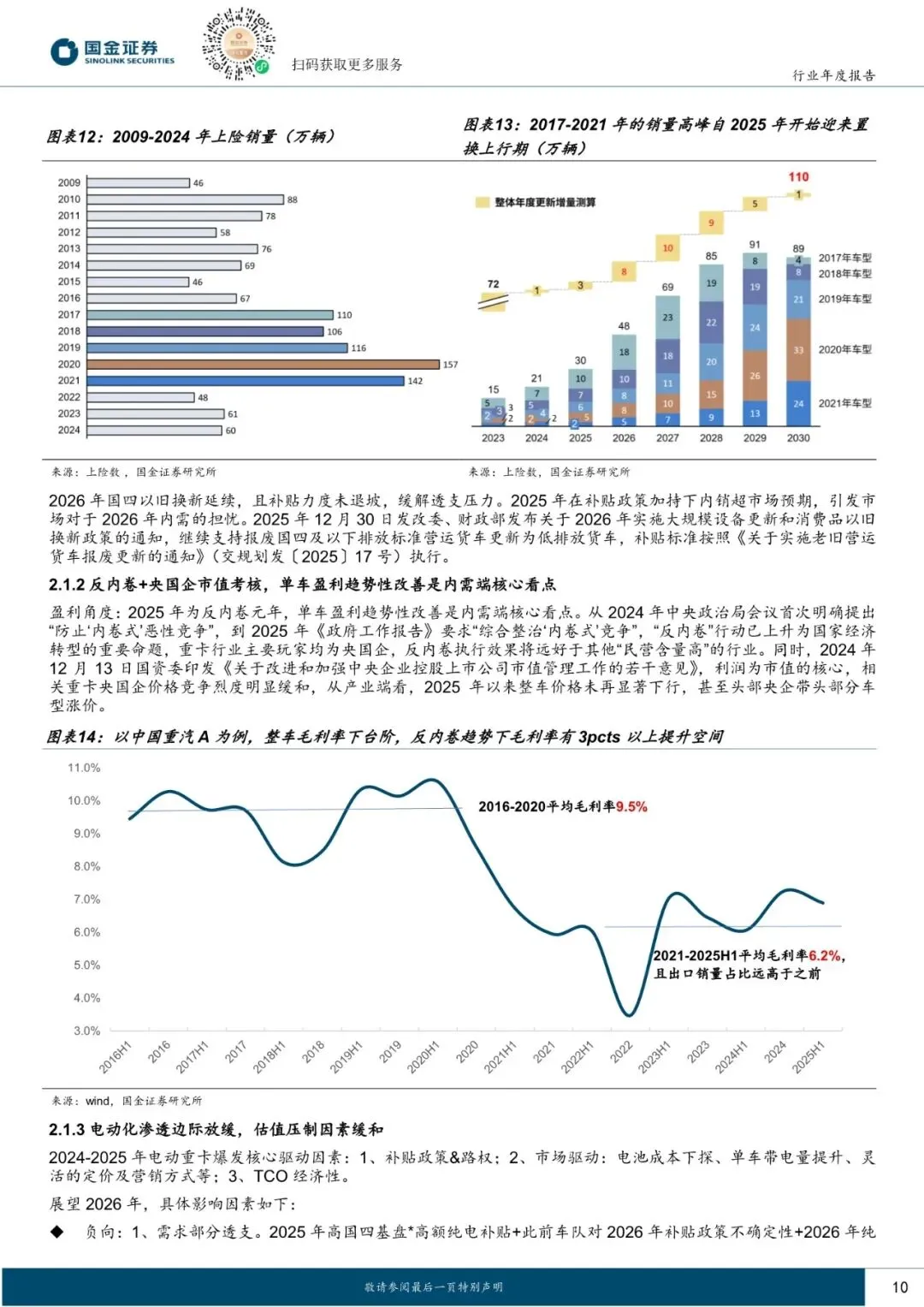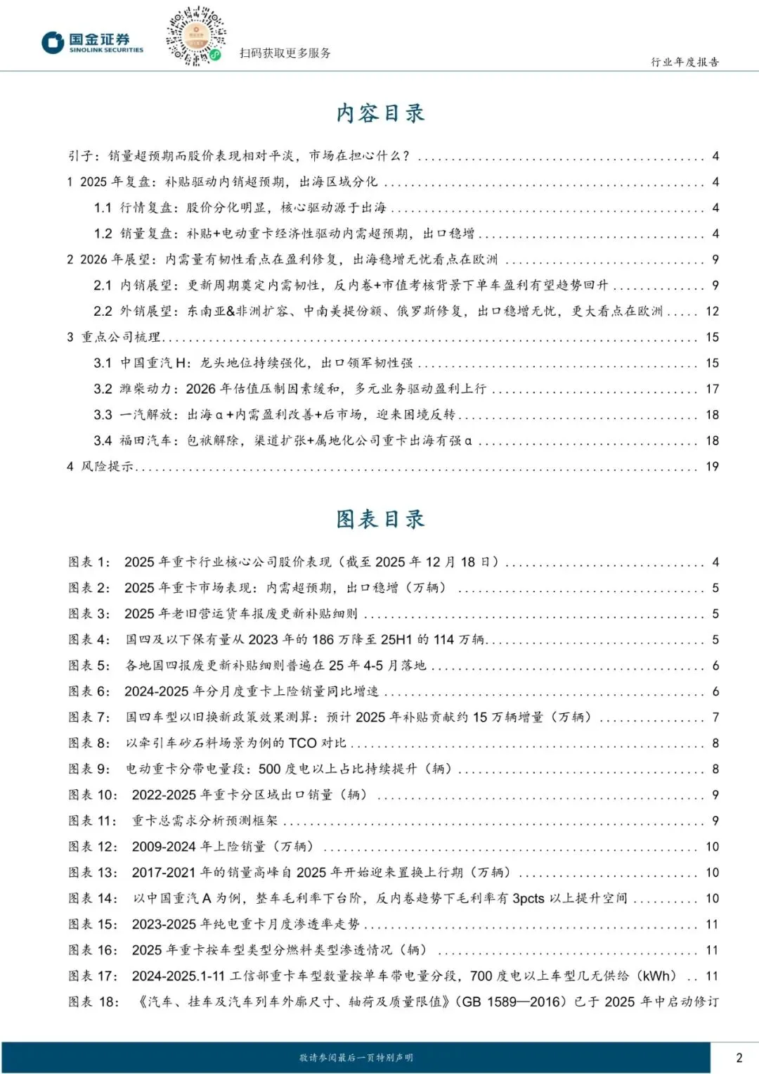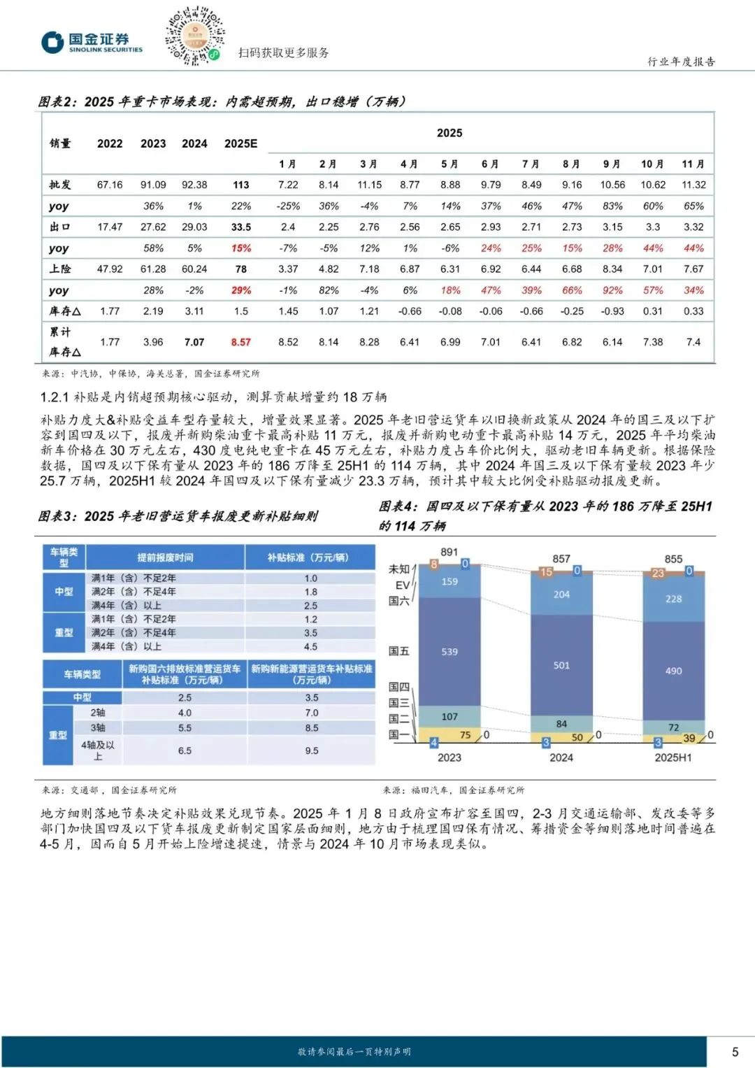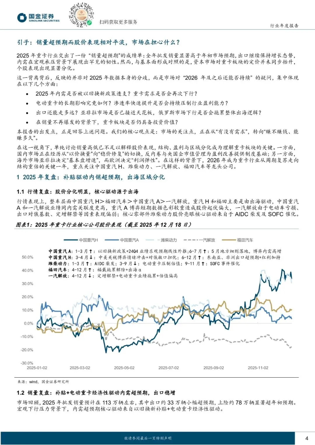 2025年重卡行业销量超预期而资本市场对板块的定价并未同步抬升,这一背离背后,反映的并非对2025年数据本身的分歧,而是市场对“2026年及之后还能否持续的疑问,集中体现在以下几个方面:1、2025年内需是否被以旧换新政策透支?2、电动重卡的长期影响究竟如何?3、出口还能走多远?4、在销量 能不再爆发的背景下,重卡板块是否仍具备投资价值?本报告的出发点正是回答上述问题。