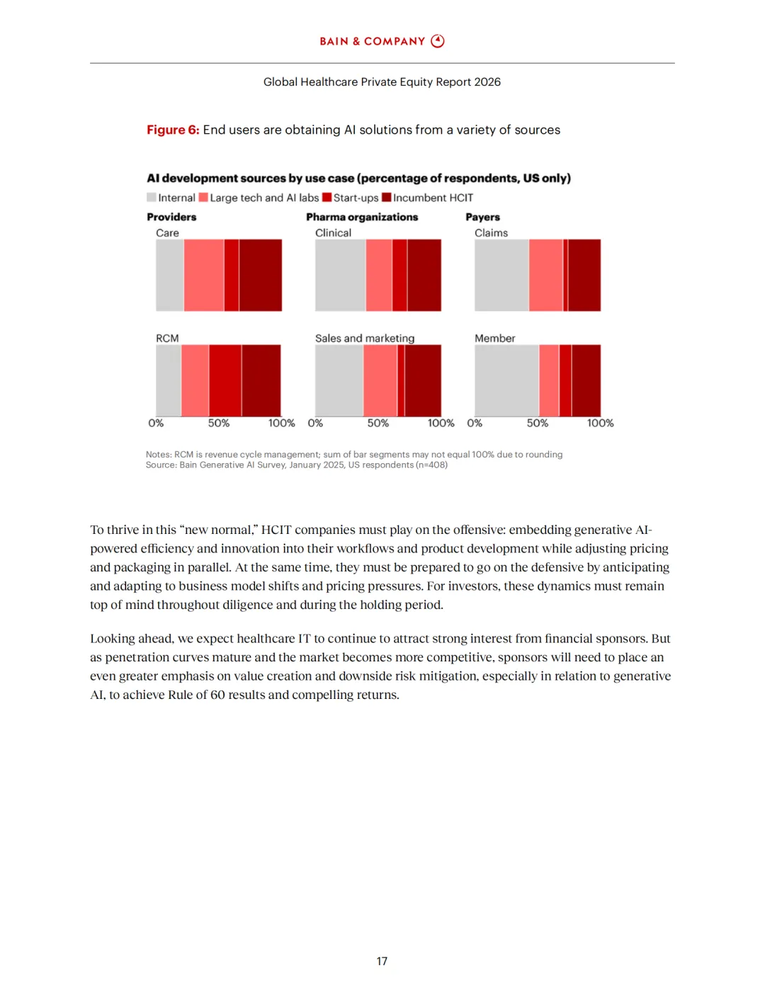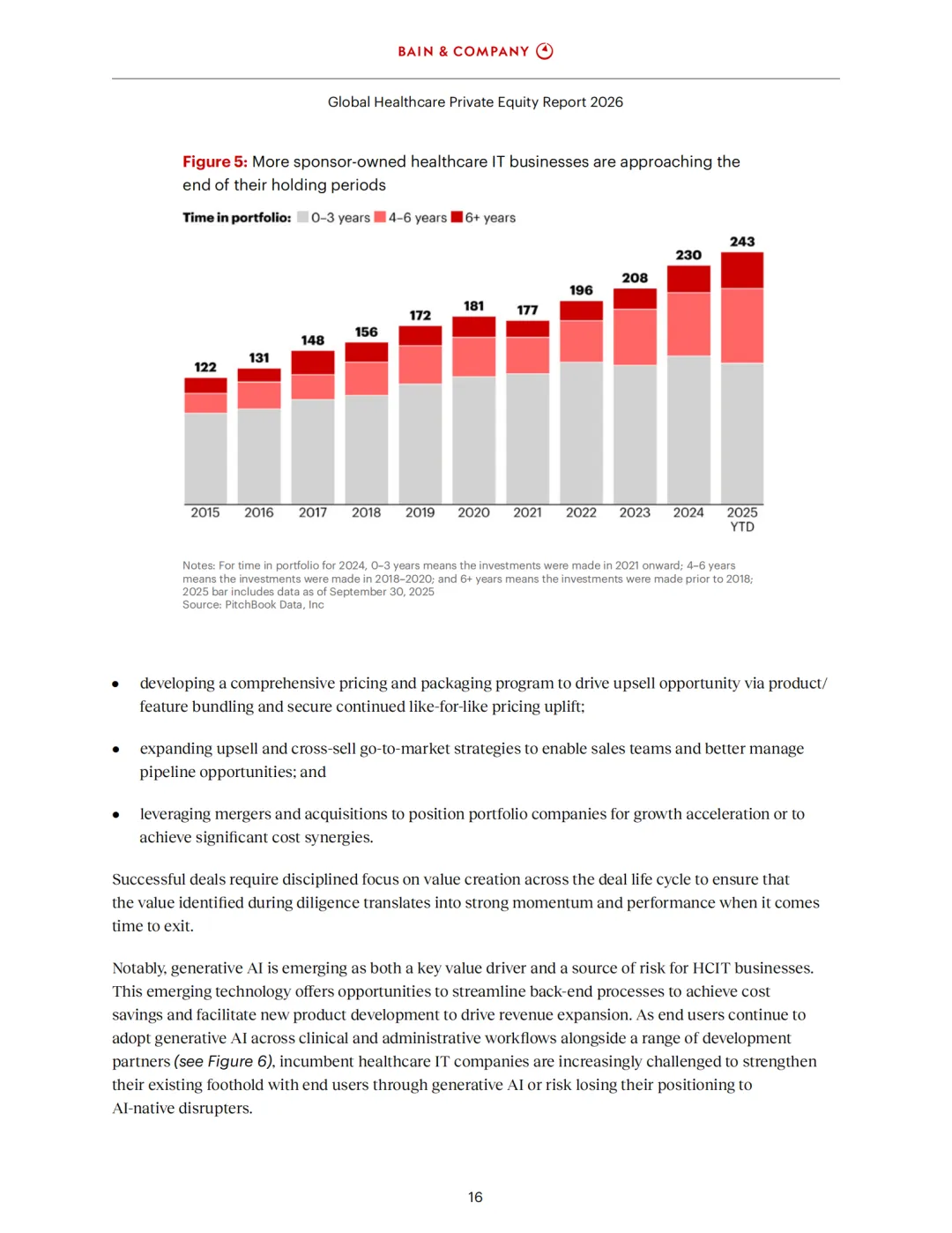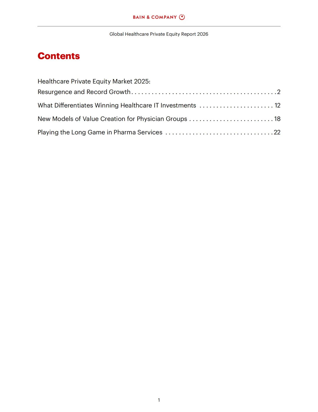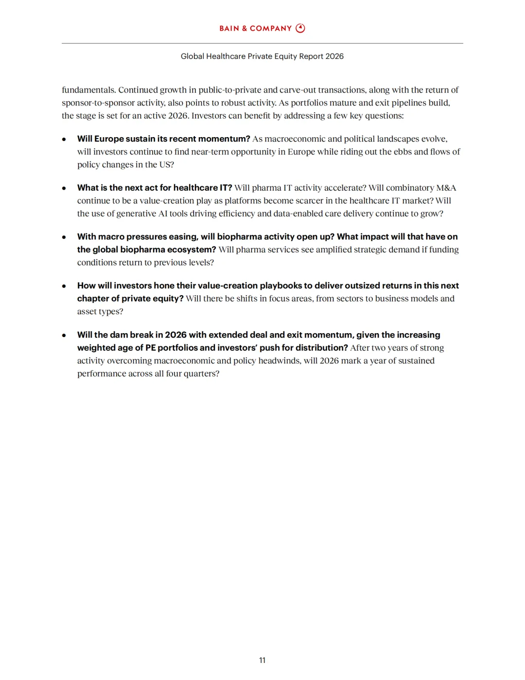 展望 2026 年,市场整体谨慎乐观,但仍面临欧洲增长持续性、医疗 IT 与生物制药行业发展路径、价值创造策略迭代等关键问题。随着基金组合资产到期与退出渠道拓宽,预计 2026 年全球医疗健康 PE 市场将维持活跃态势,投资者需在行业变革中精准把握细分赛道机遇。