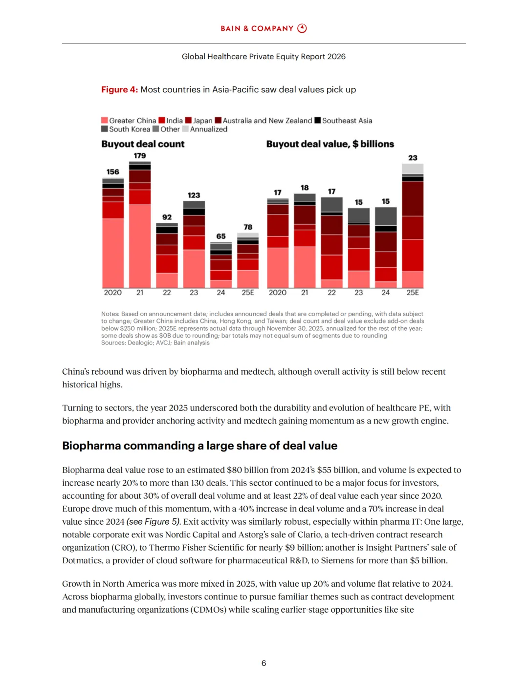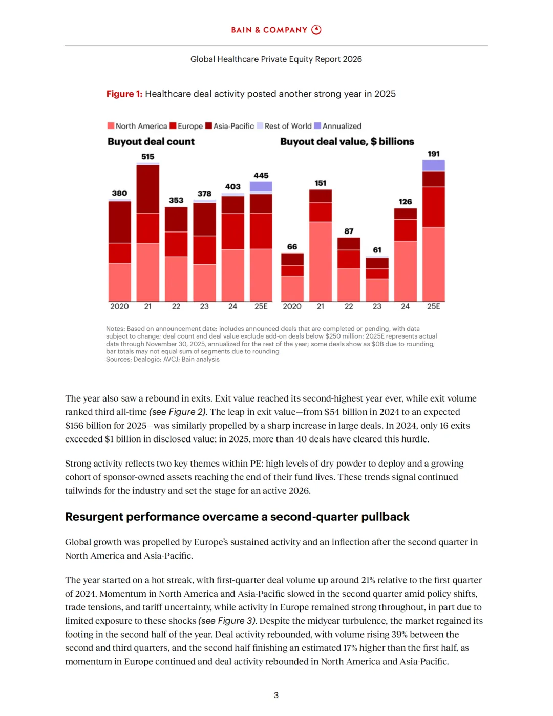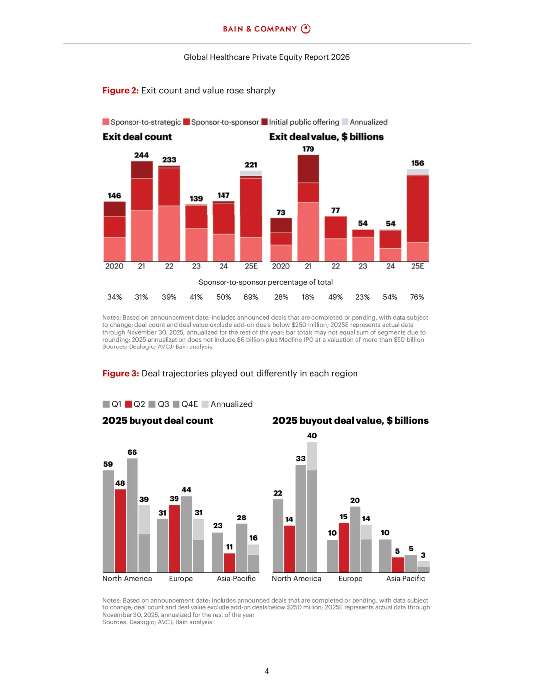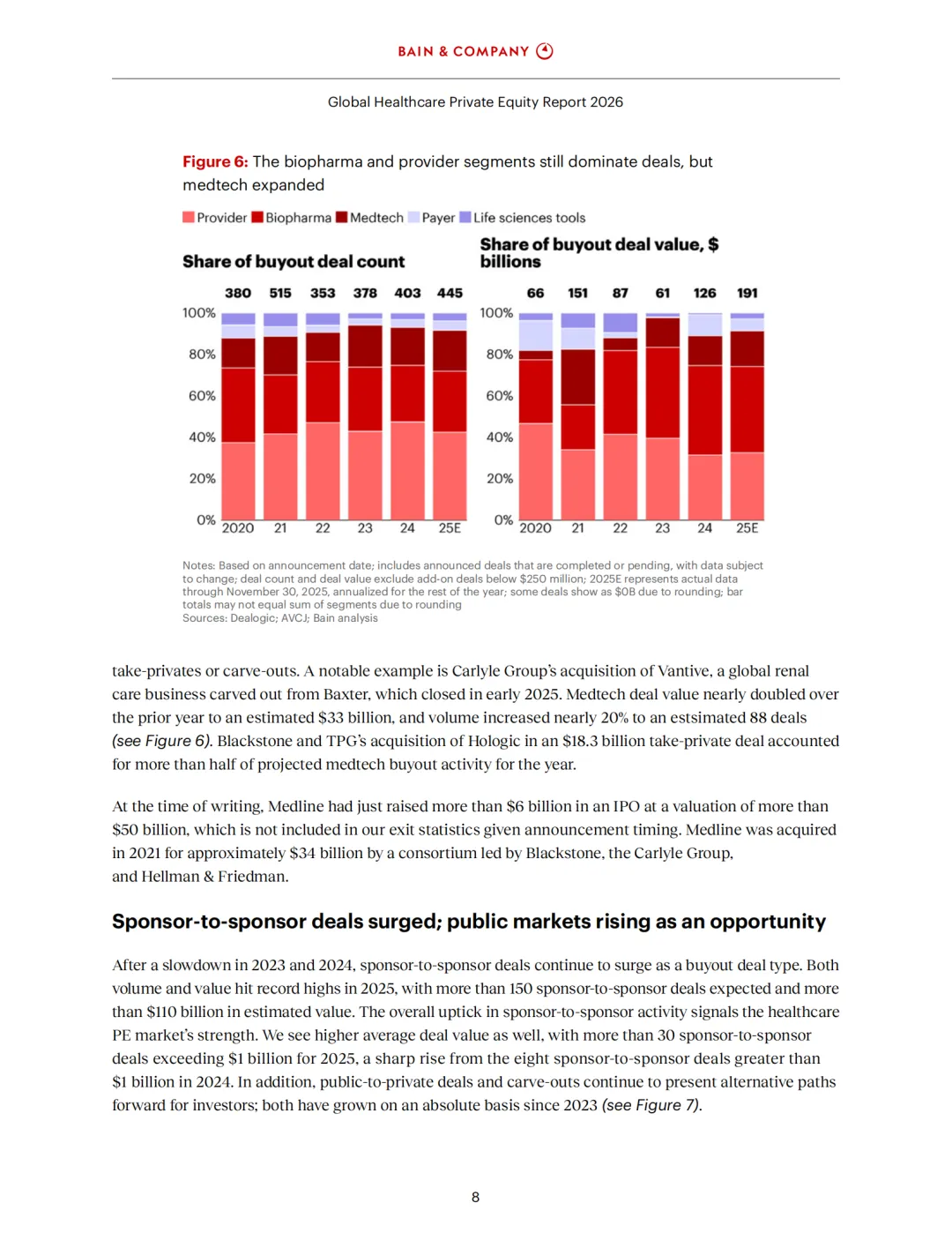 行业板块方面,生物制药持续领跑,交易价值达 800 亿美元,占全球总交易价值的重要份额,欧洲是主要增长引擎;医疗服务机构交易价值增长 57% 至 620 亿美元,医疗 IT 技术赋能成为核心驱动力,相关交易价值翻倍至 320 亿美元;医疗技术自 2020 年起增速显著,2025 年交易价值近乎翻倍至 330 亿美元,黑石与 TPG 以 183 亿美元收购 Hologic 等大额交易成为亮点。
