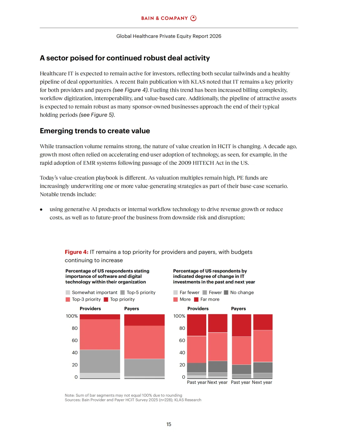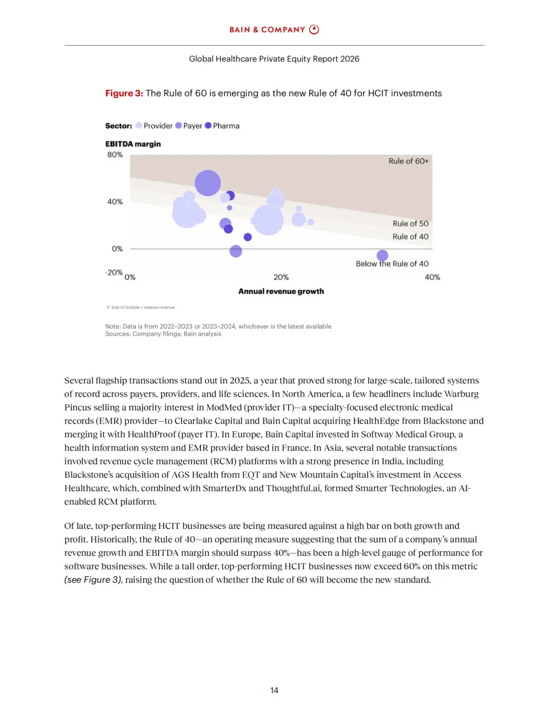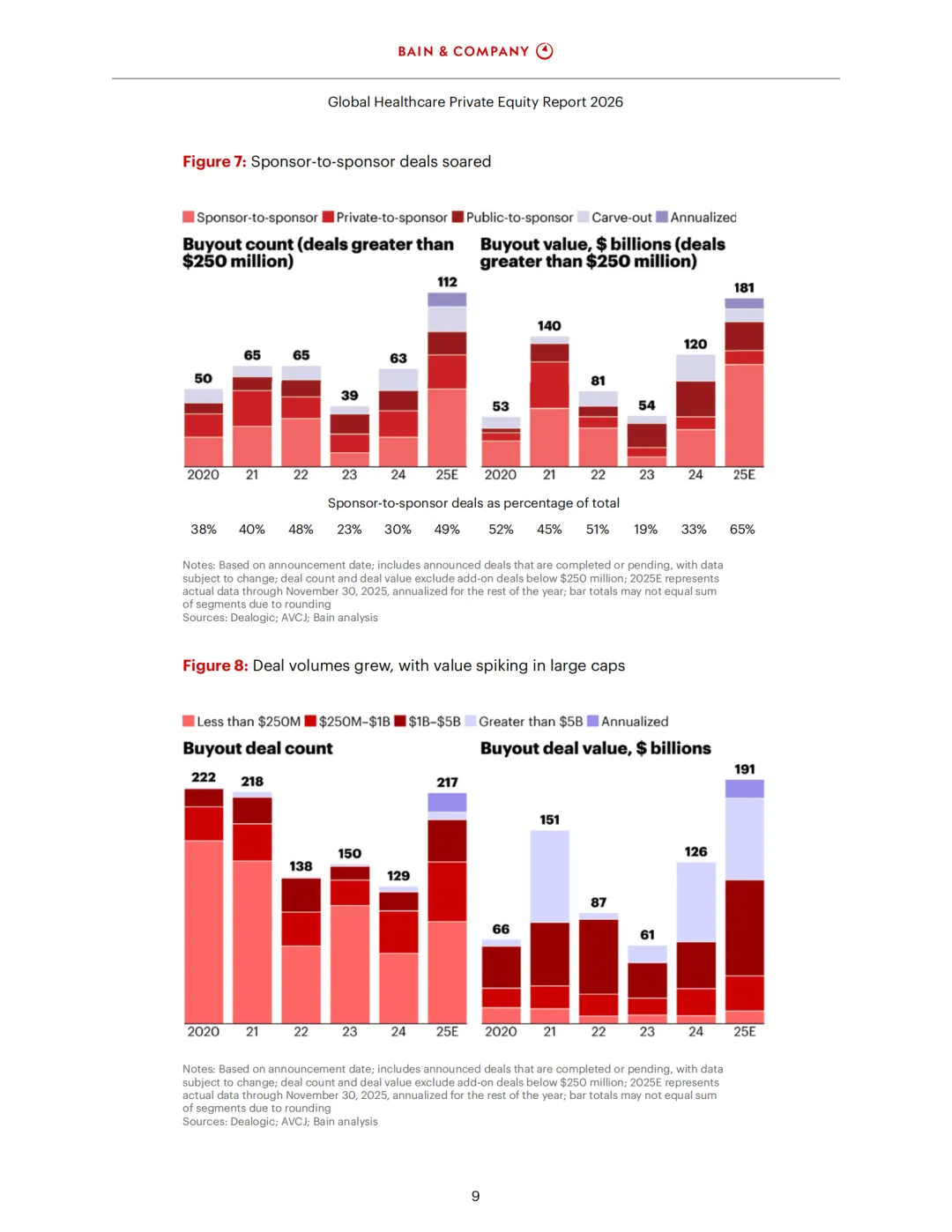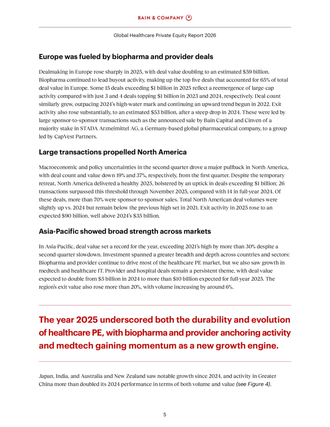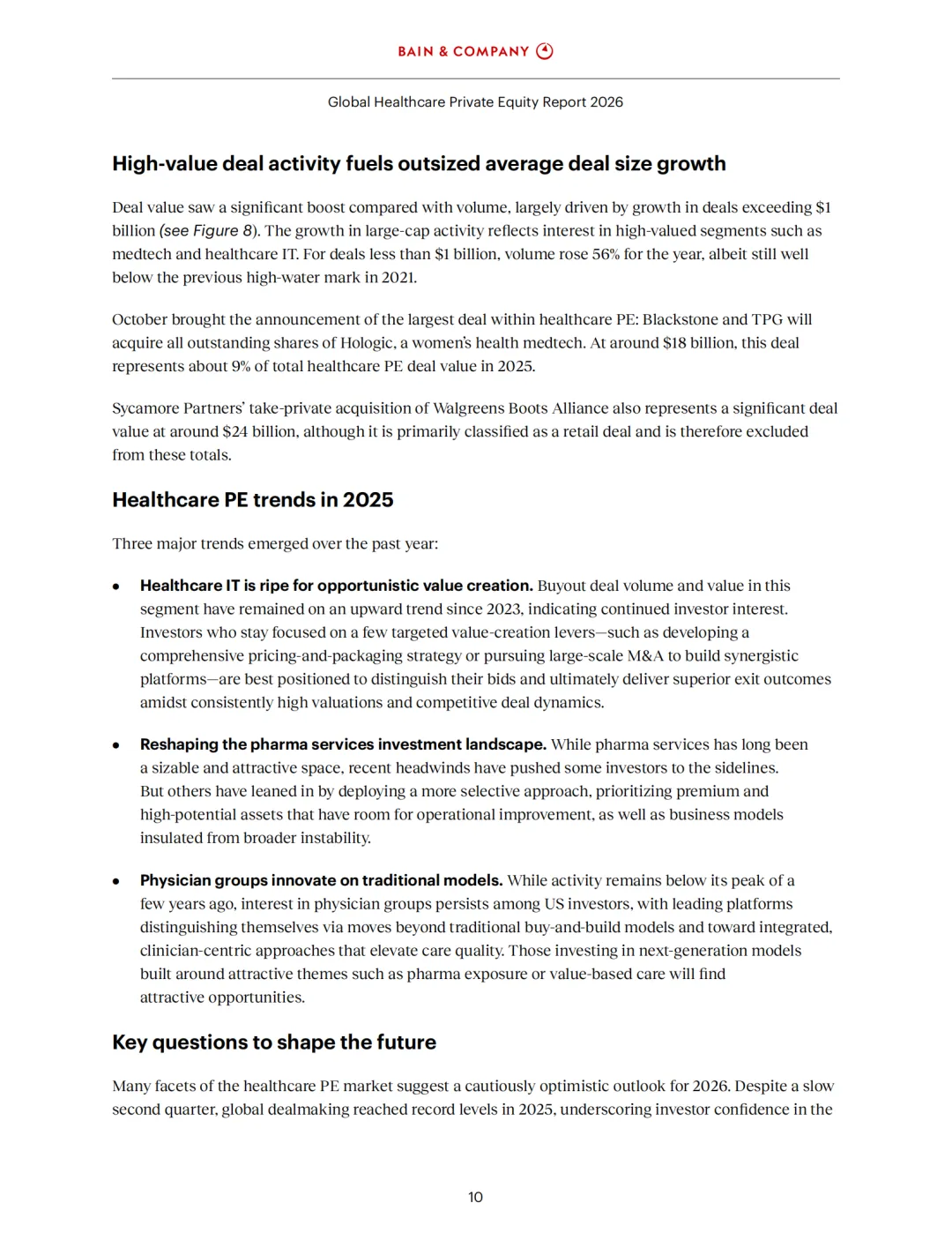 行业板块方面,生物制药持续领跑,交易价值达 800 亿美元,占全球总交易价值的重要份额,欧洲是主要增长引擎;医疗服务机构交易价值增长 57% 至 620 亿美元,医疗 IT 技术赋能成为核心驱动力,相关交易价值翻倍至 320 亿美元;医疗技术自 2020 年起增速显著,2025 年交易价值近乎翻倍至 330 亿美元,黑石与 TPG 以 183 亿美元收购 Hologic 等大额交易成为亮点。