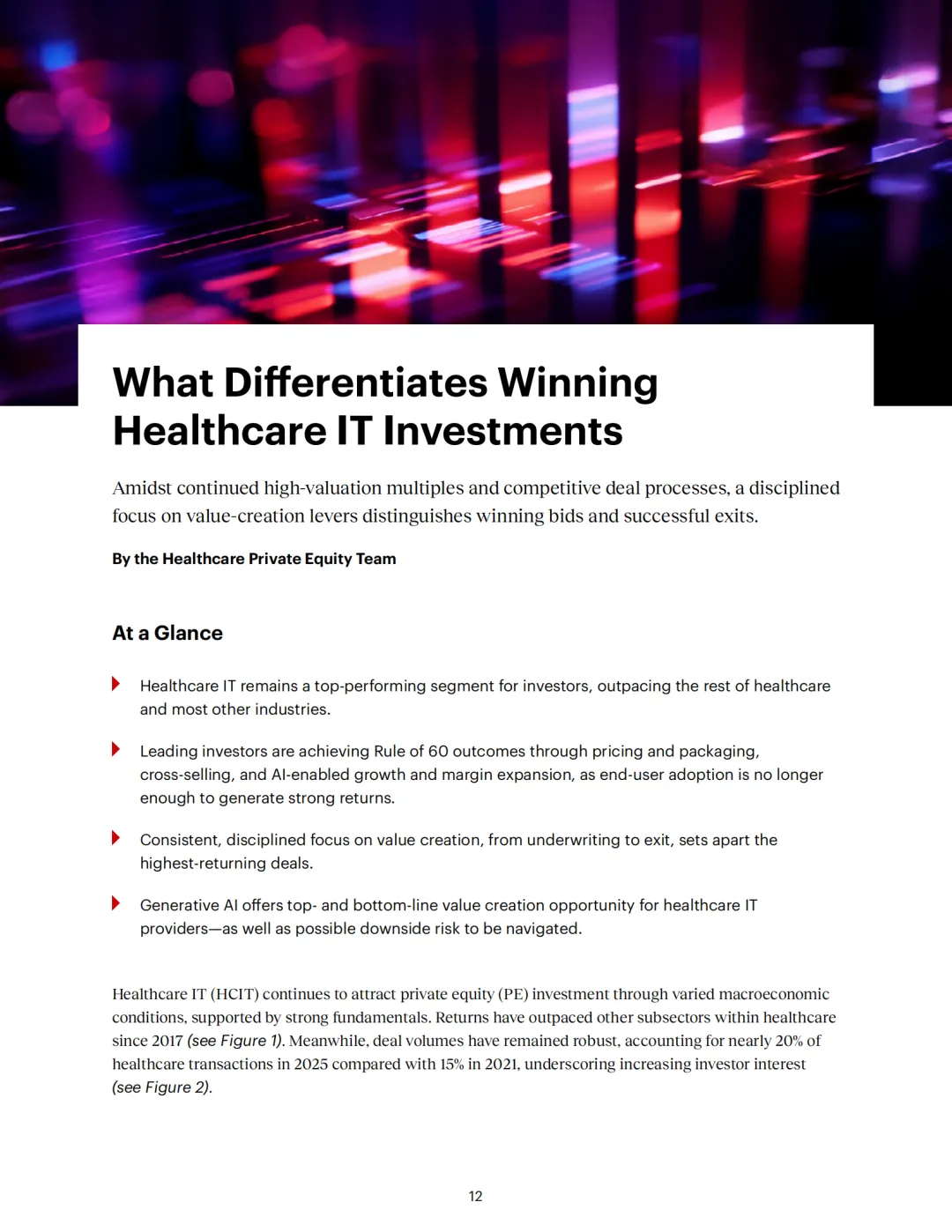 2025 年市场涌现三大核心趋势:医疗 IT 领域价值创造机遇凸显,投资者聚焦定价策略、并购整合与 AI 应用;制药服务领域投资者转向优质资产与抗风险业务模式,通过精细化运营挖掘价值;医生集团投资超越传统并购模式,向整合化、技术驱动型平台转型,聚焦专科药物、价值医疗等赛道。
