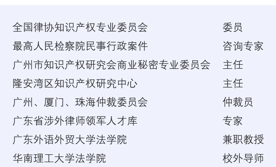 受政府部门和协会委托,参与起草《网络游戏商业秘密保护指引》和《绿色石化与新材料行业商业秘密管理保护工作指引》等商业秘密行业指引。