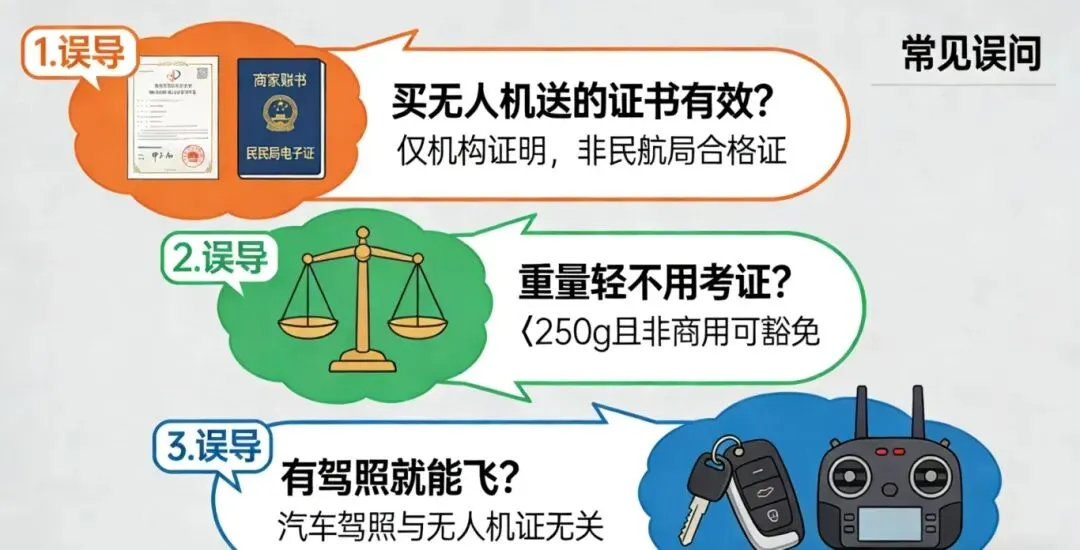 ✅ 警惕!部分商家赠送的“培训证书”仅为机构证明,不是民航局合格证,不能用于商业飞行。