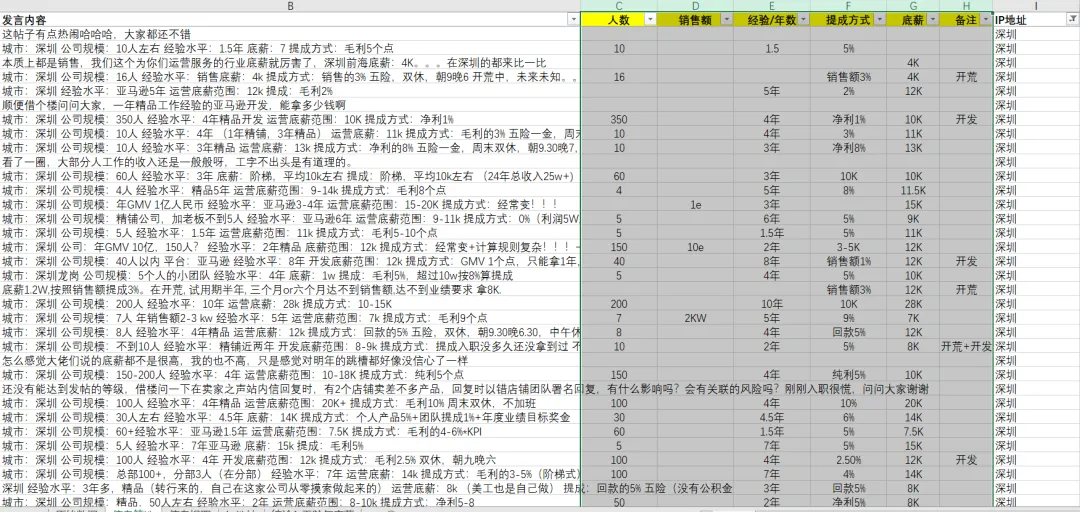 其中对我们有用的信息为发帖ip,发帖内容,以及发帖时间。发帖内容又包含了城市,公司规模,底薪,提成,职业等重要信息。我们利用工具进行整理细化,得出结果如下:
