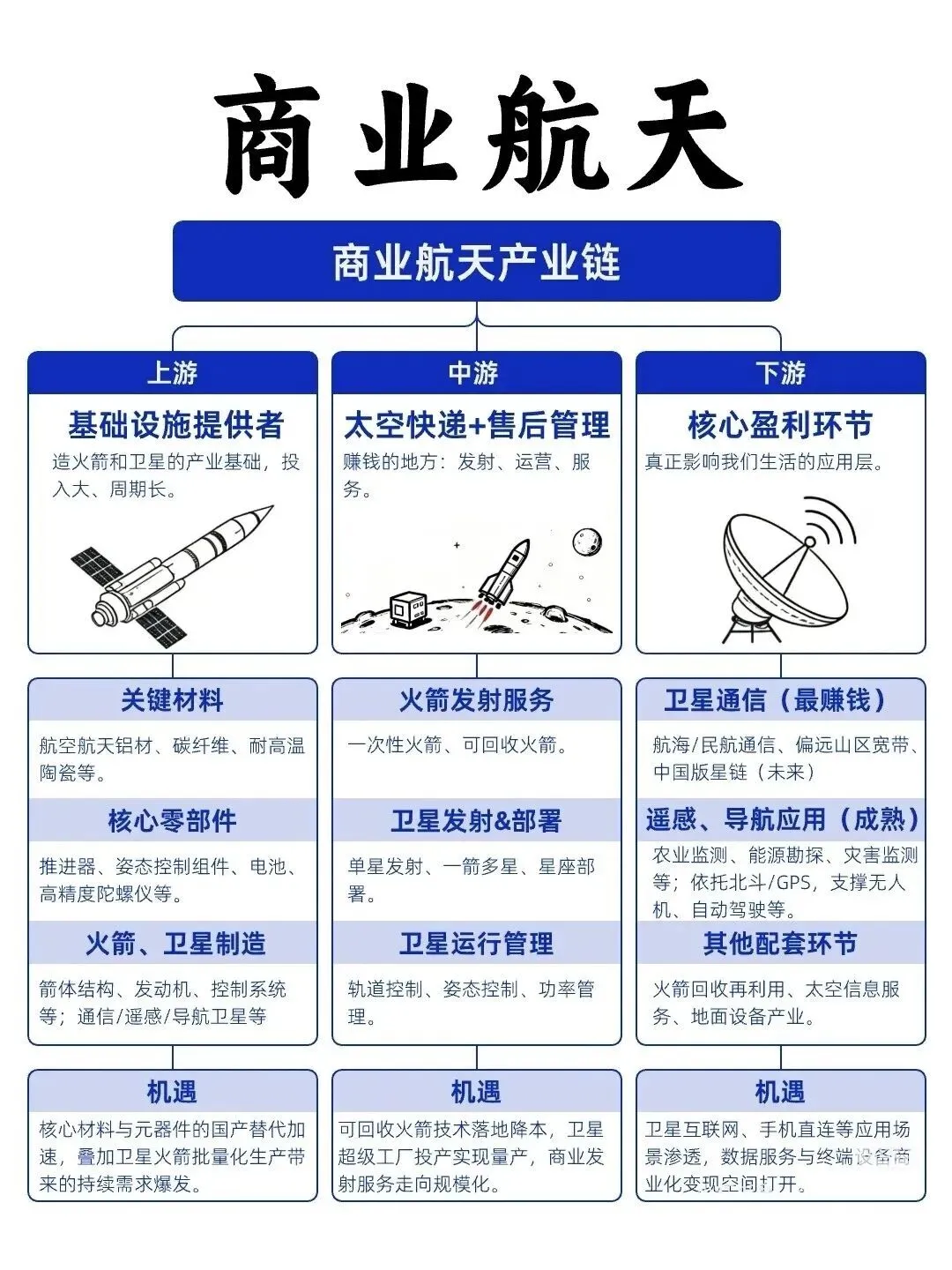 火箭发射服务:海南商业航天发射场等投用,缓解“星多箭少”,负责将卫星送入预定轨道,是连接上游制造和下游应用的关键环节。国内发射服务以长征系列火箭为主,民营火箭企业也在逐步参与市场竞争。可重复使用火箭技术的应用是降低成本、提高发射效率的重要方向。