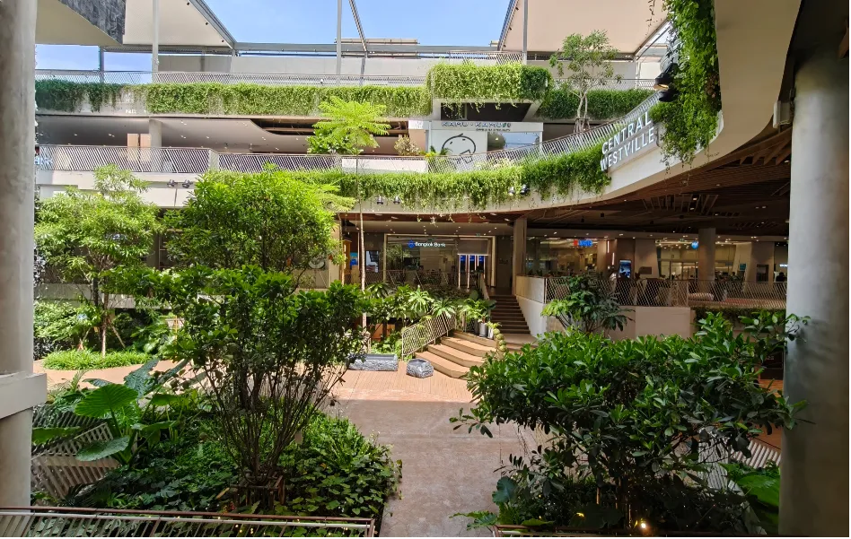 许多曼谷商场采用了半开放式或半室外的设计,如CENTRAL WESTVILLE,商场内部装饰采用了大量的自然材料,以白色为主色调的空间内布置了大量植物,营造出一种仿佛置身于热带雨林的舒适氛围。这种设计不仅增加了空气流通,也让顾客在购物之余能够享受到自然的光线与空气,感受到一种难得的松弛感。