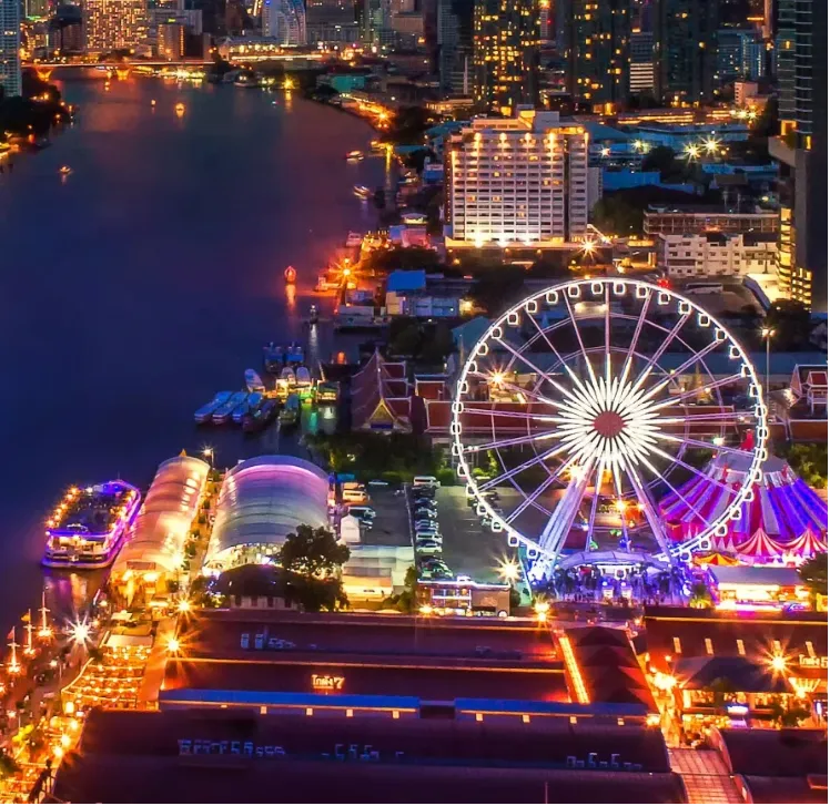 ASIATIQUE THE RIVERFRONT(湄南河畔夜市)又称摩天轮夜市,前身是港口码头的一个仓库,被翻新建设成为现在的ASIATIQUE,目前是曼谷最大的河畔夜市。夜市干净整洁,交通便利,一面紧邻喧闹的CHAROEN KRUNG大道,另一面紧邻湄南河畔,游客既可以选择搭乘出租车前往,也可以选乘渡船。由于夜市紧邻湄南河畔,在逛夜市的同时吹吹河风,欣赏河畔两岸的夜景。