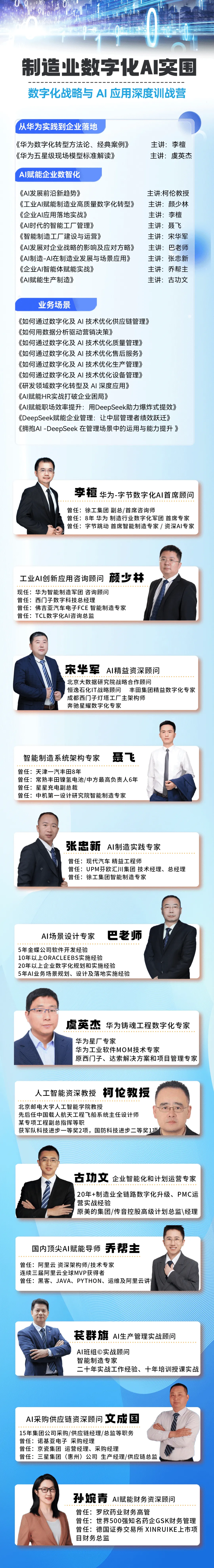 李檀老师的优势源自其罕见的复合型背景:横跨华为、字节跳动等科技巨头的前沿实践,又深植于装备制造等传统行业的深厚土壤。 这种跨界经历,使其能将晦涩的生成式AI、工业互联网、数字孪生等概念,精准转化为企业管理者听得懂、一线员工用得上的方法论与工具。