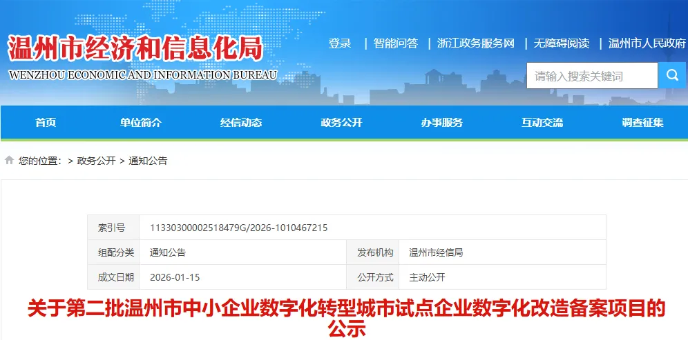 根据《关于开展首批温州市中小企业数字化转型城市试点企业数字化改造项目备案的通知》要求,经企业申报、属地推荐、市级复核环节,现将第二批温州市中小企业数字化转型城市试点企业数字化改造备案项目名单(38家)予以公示,公示期2026年1月15日—1月17日,如有异议,请于公示期间与市经信局数字经济处联系。