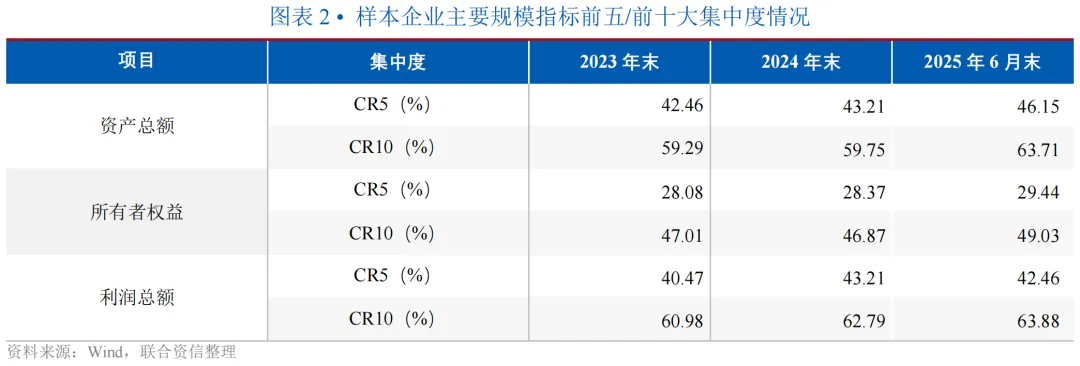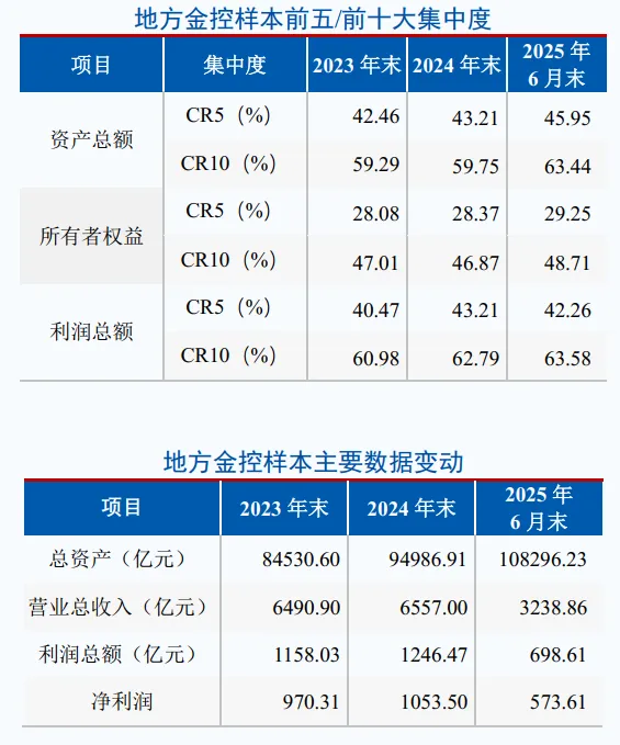 从利润集中度来看,样本企业利润集中度同样维持高位并略有波动,CR5在2024年达到43.21%的高点后,2025年6月末微降至42.46%,部分头部企业在经济筑底复苏阶段盈利承压;CR10则从2023年的60.98%持续增至2025年6月末的63.88%,地方金控利润创造能力高度集中于头部企业。