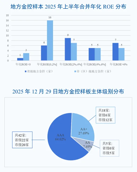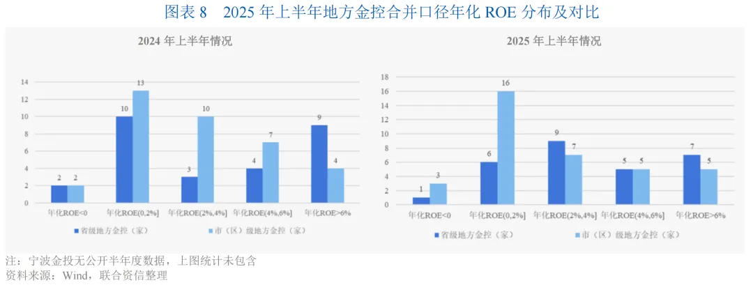 地方金控合并口径盈利表现出现分化,省级平台整体表现强于市区级平台,母公司口径盈利能力仍较弱。