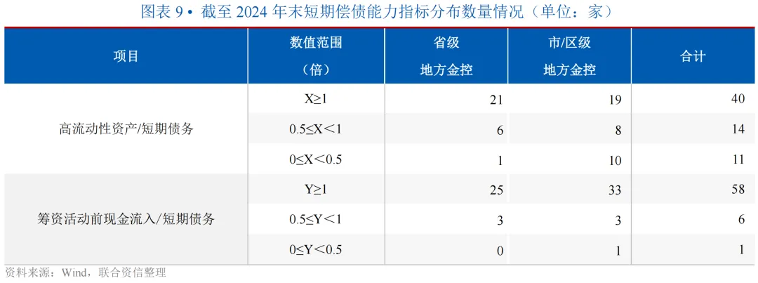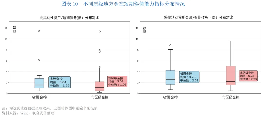 2024年末,省级金控短期偿债能力整体优于市区级金控,省级金控流动性更稳定、风险更分散,而市区级金控流动性风险呈批量集中态势,但结合当前整体较为宽松的融资环境,地方金控流动性风险相对可控。