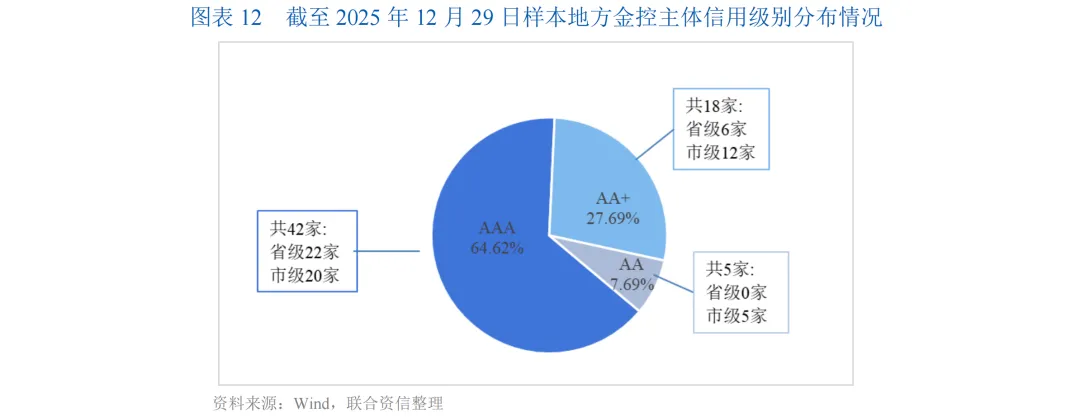 从外部信用级别情况来看,得益于自身良好的经营能力、较强股东背景及区域内重要战略地位,地方金控主体信用级别整体处于较高水平,以AAA及AA+为主(合计占比92.31%),其中省级平台相较市级平台的信用资质较好。截至2025年12月29日,28家省级样本平台中主体级别为AAA级别占比78.57%;AA+级别企业6家;37家市级样本平台中主体级别为AAA和AA+的分别占比76.92%和46.15%,AA级别主体5家控。