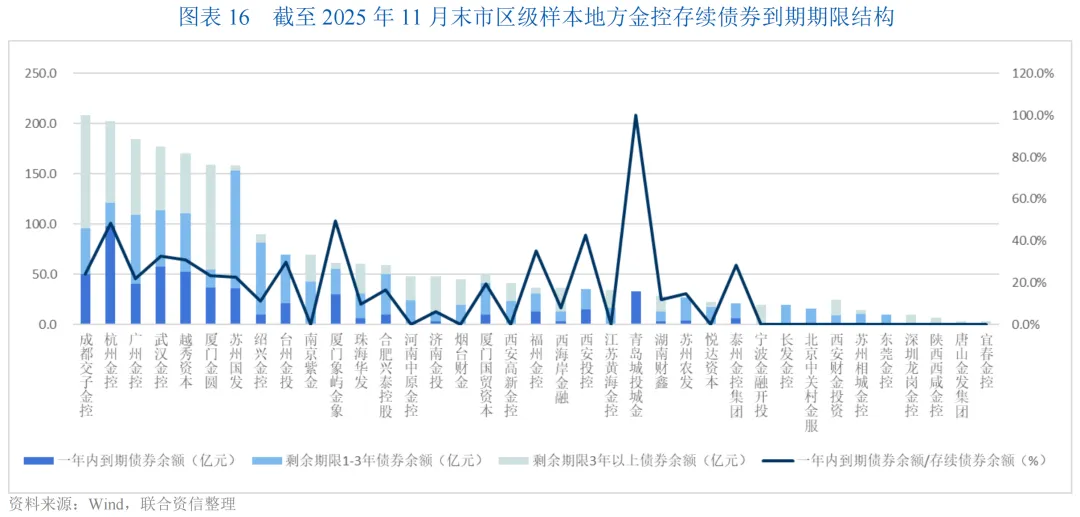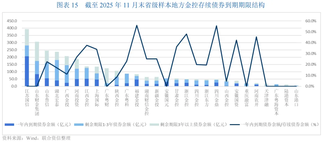 存续债券方面,截至2025年11月末,65家地方金控存续债券规模合计5297.95亿元,其中省级平台存续债券规模合计2989.44亿元,市级平台续债券规模合计2308.51亿元,整体债券到期期限结构较合理,以长期为主,一年内到期债券余额/存续债券余额比例超过50%的平台仅4家,包括江苏国信、安徽国元、四川金鼎及青岛城投城金。