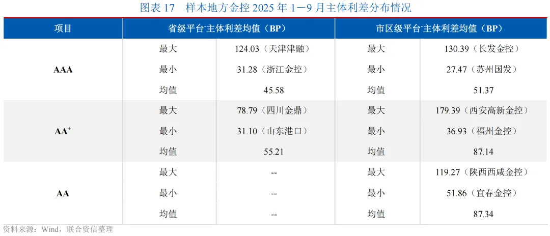 从省级地方金控情况来看,2025年1-9月,28家省级样本平台利差主要处于50BP以下区间,较2024年水平略有下降;利差高于100BP的1家,为天津津融(AAA,124.03BP),利差高于80BP但在100BP以下的1家,为广西金投(AAA,96.20BP)。
