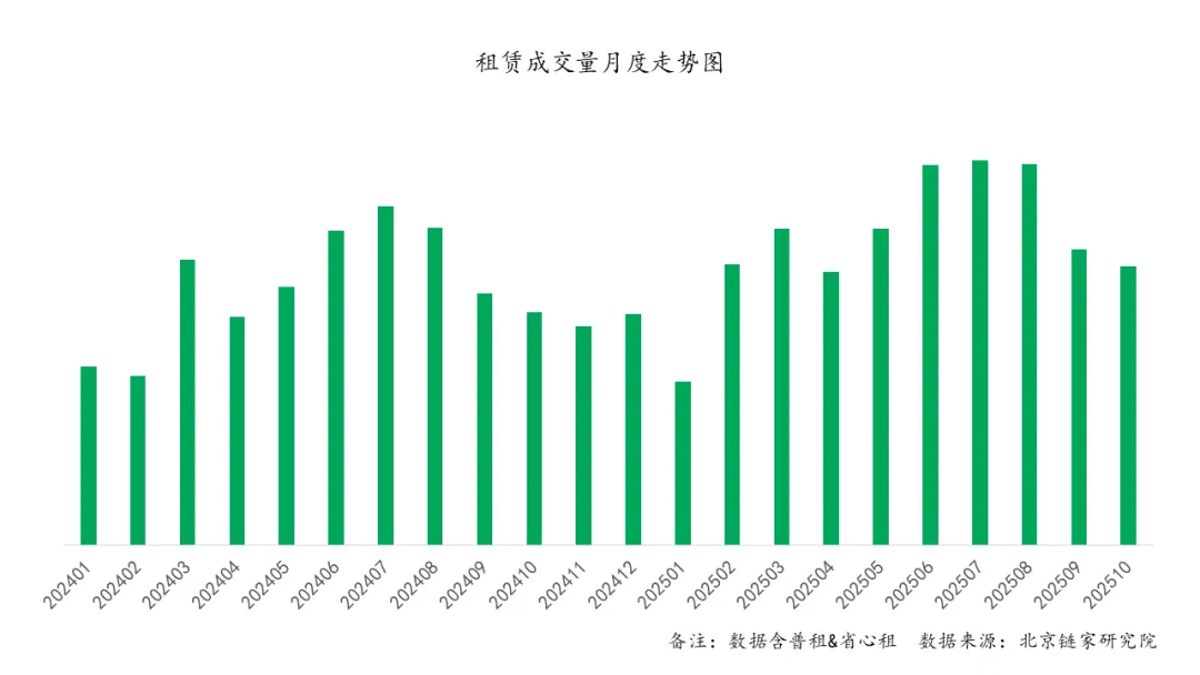 2025年10月经北京链家成交的住房租赁单量环比下降5.7%,同比增长19.7%。
