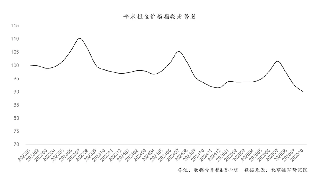 从租金水平来看,2025年10月北京整体租金价格季节性下降,单位租金为78元/㎡,环比下降2.5%。