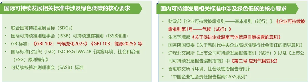 《绿色低碳发展报告评级标准(2026)》充分借鉴财政部等九部门《企业可持续披露准则——基本准则(试行)》《企业可持续披露准则第1号——气候(试行)》、生态环境部等四部门《关于促进企业温室气体信息自愿披露的意见》等中国可持续发展相关指引、准则、标准中,涉及绿色低碳信息披露的核心要求,确保评级标准贴合中国发展实际与监管要求。