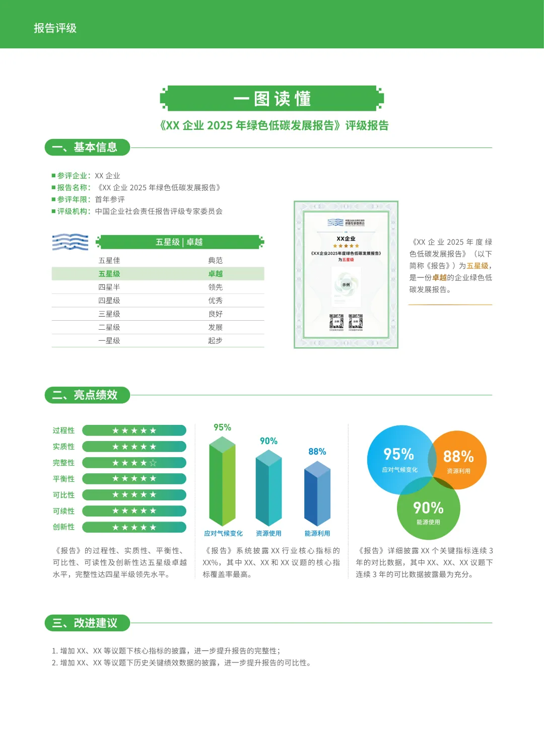 报告评级不仅是一次权威的第三方“体检”,更是一次对企业绿色低碳发展报告亮点的系统梳理与集中呈现。完整版评级报告与“一图读懂”评级报告的“双重加持”,不仅让专业人士信服,更让大众读者易懂。