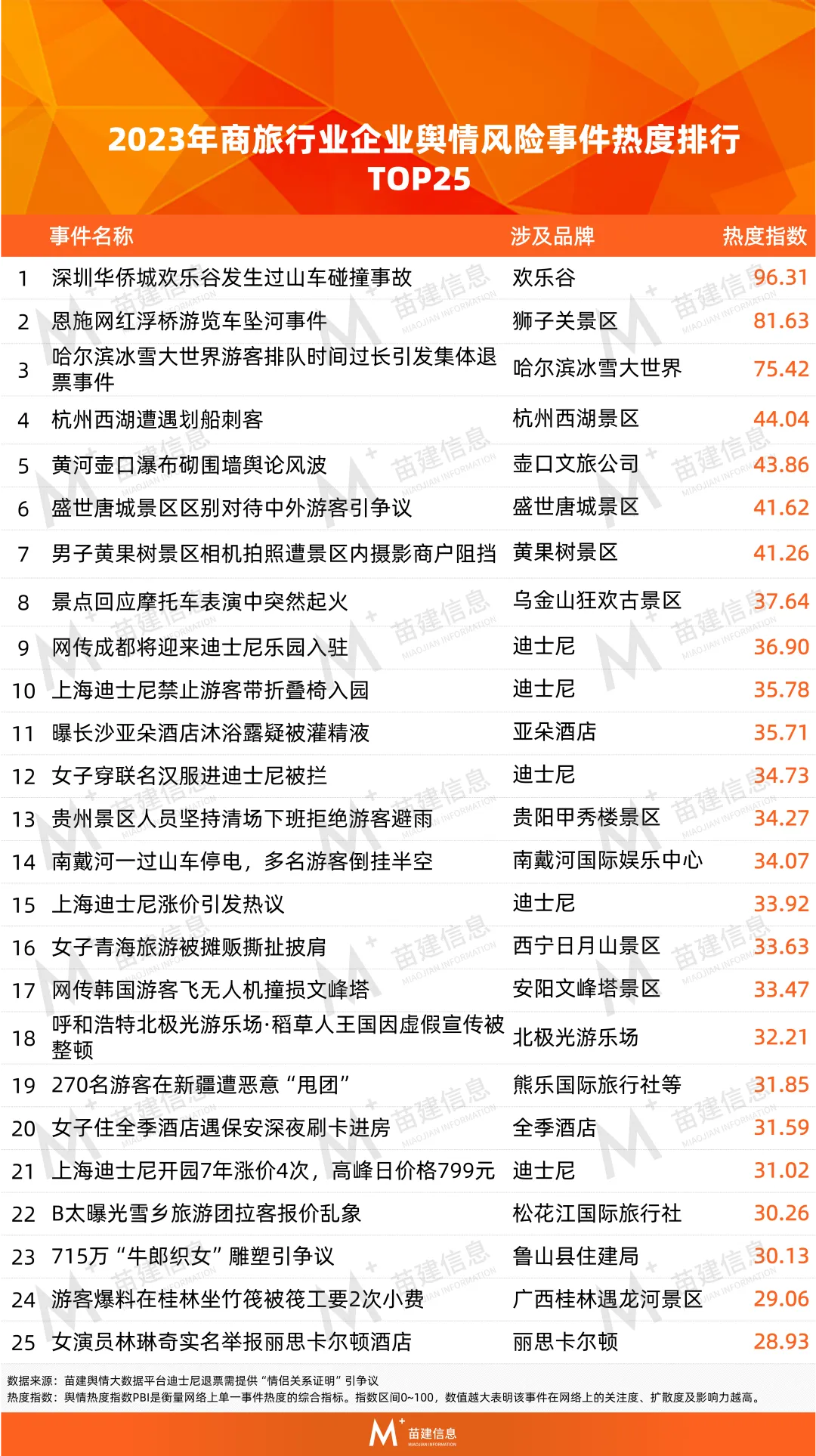 《2025年商旅行业企业舆情风险事件热度排行TOP50》节选自苗建信息《中国企业舆情风险年度报告(2025)》,事件排名基于苗建信息编制的PBI(Public Buzz Index)舆情热度指数体系