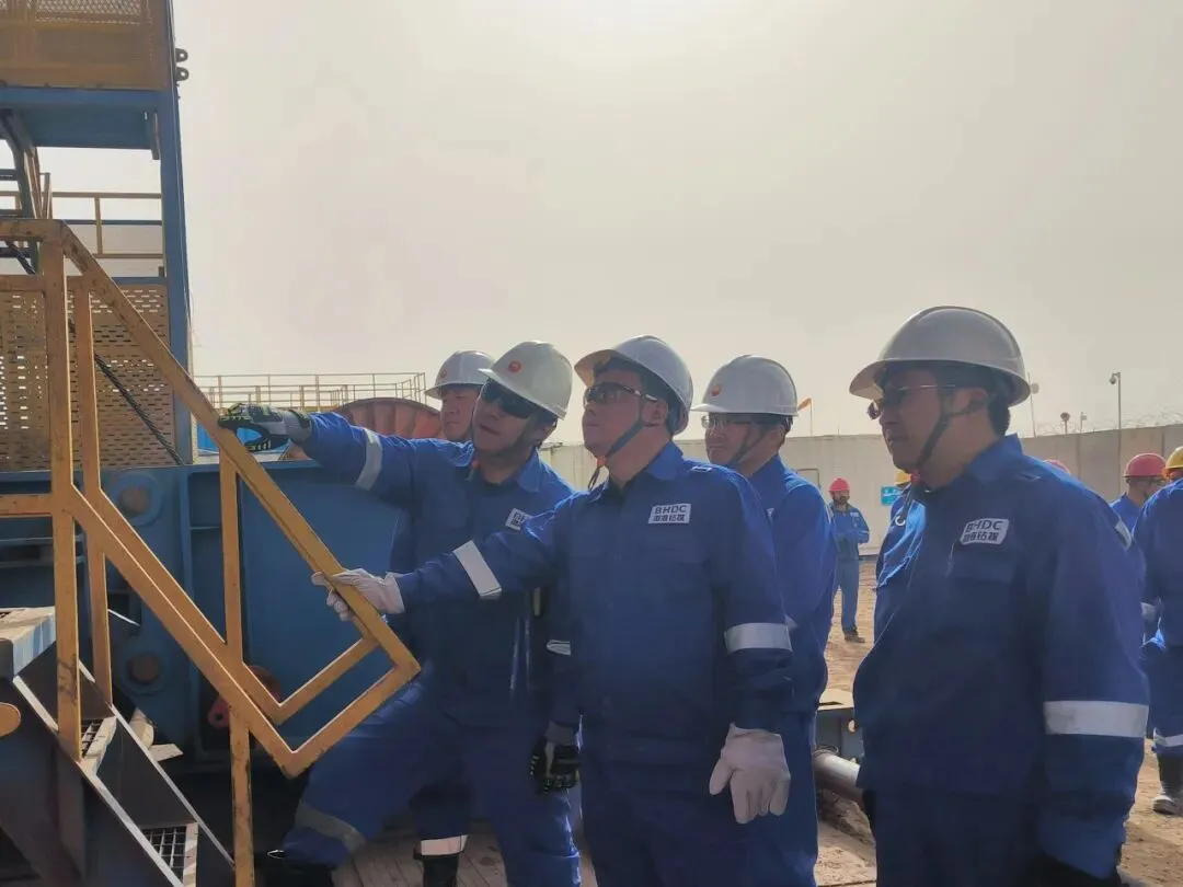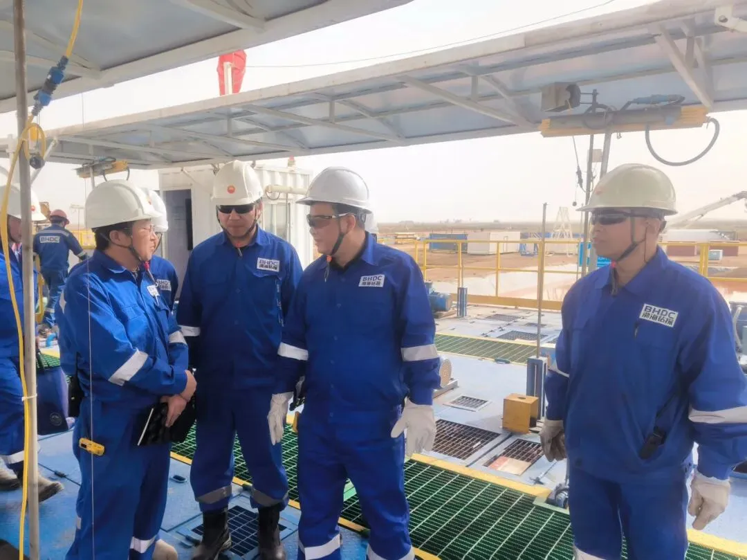 调研期间,刘平江先后前往BHDC-32与BHDC-34钻井队作业现场,实地查看井场布局,重点检查了钻台、罐区、泵房等关键区域设备运行和现场管理情况。在认真听取哈法亚项目及两支钻井队负责人工作汇报后,刘平江与一线干部员工亲切座谈交流,详细了解大家的工作与生活状况,对哈法亚项目和BHDC-32队、BHDC-34钻井队取得的工作成绩给予充分肯定。针对员工反映的具体问题,现场协调资源制定解决方案。