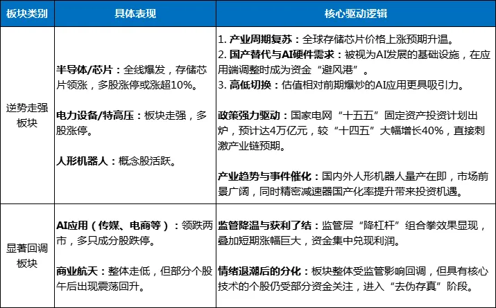⑴硬科技与政策驱动:持续关注资金流入明显的半导体(尤其存储芯片)、受益于明确投资计划的电力设备/特高压,以及产业趋势确定的机器人板块。