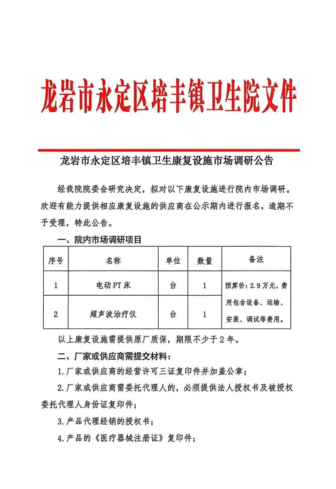 龙岩市永定区培丰镇卫生院康复设施市场调研公告