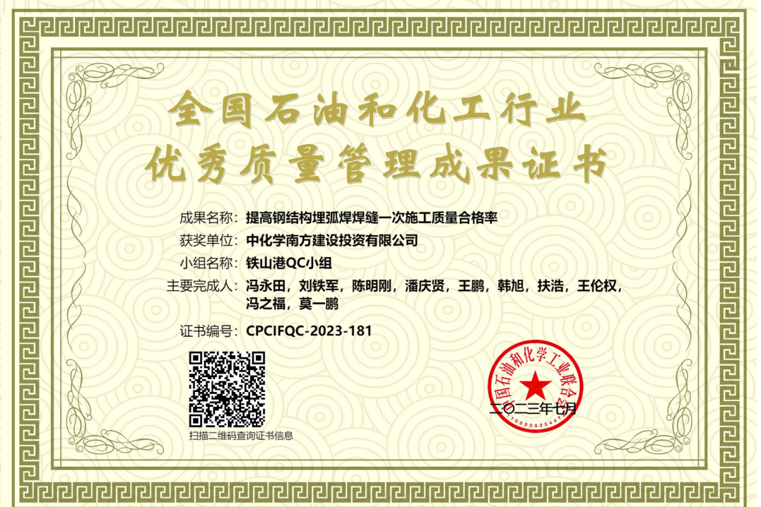 8月18日,从中国石油和化学工业联合会质量工作委员会传来喜讯,南投公司铁山港QC小组“提高钢结构埋弧焊焊缝一次施工质量合格率”荣获2023年全国石油和化工行业优秀质量管理成果奖。