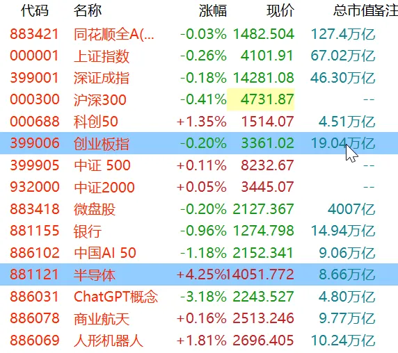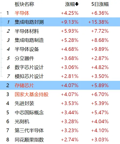 昨晚台积电的财报,引燃了半导体和AI相关。 今日盘面上涨幅居前的都是半导体板块,其中细分7个板块中,存储+封测+设备+材料最猛。