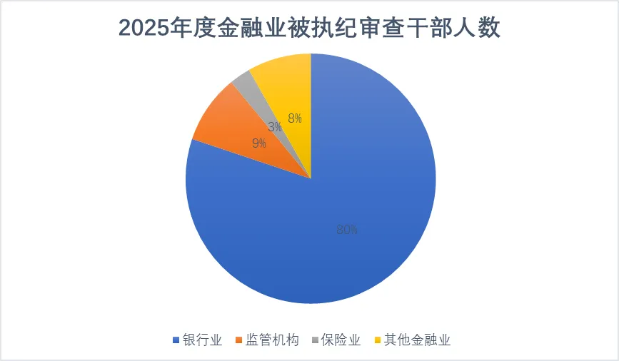 根据中央纪委国家监委公开信息的不完全统计,2025年全年各级金融单位被执纪审查干部共计146人。其中银行业117人,占比约80%;监管机构13人,占比约9%;保险业4人,占比约3%;担保公司、金控集团、证券投资等其他金融行业12人,占比约8%。