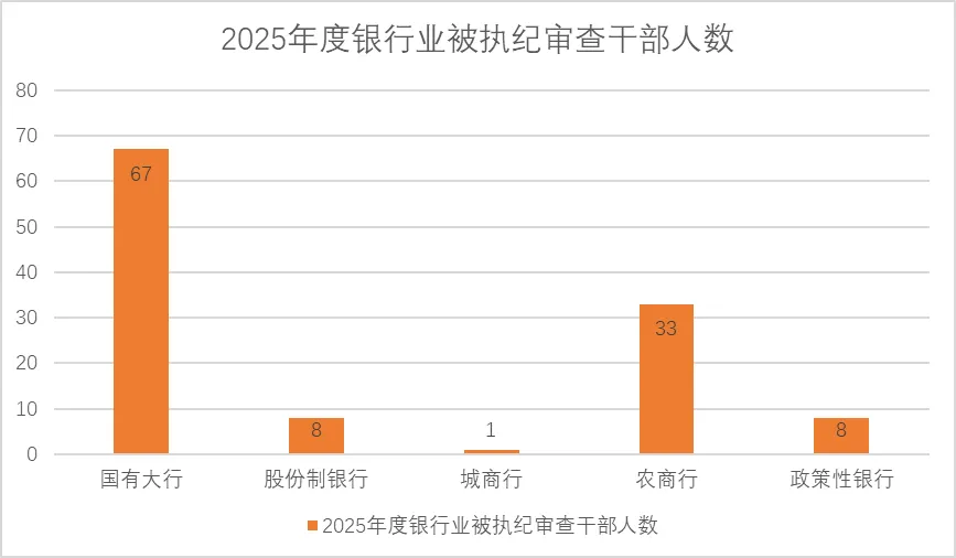 从2025年度银行业被执纪审查的干部人数分布来看,遍布国有大型银行、股份制银行、城商行、农商行、政策性银行。其中,国有大行67人,股份制银行8人,城商行1人,农商行33人,政策性银行8人。