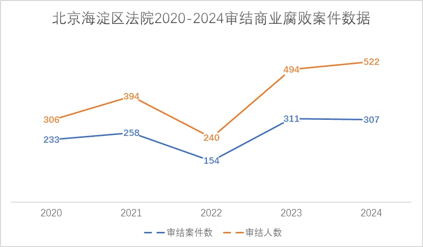 2025年5月9日,北京市海淀区人民检察院发布《反商业腐败检察工作白皮书(2020-2024)》,用过去五年来办理的1253件1956人的反商业腐败犯罪案件,以司法视角揭开了商业腐败的内幕。数据显示,近5年,海淀区商业腐败犯罪案件数量总体呈现上升趋势,分别是2020年223件306人,2021年258件394人,2022年154件240人,2023年311件494人,2024年307件522人。商业腐败犯罪案件多发领域从传统行业逐渐向互联网、人工智能、电商平台等高新科创行业蔓延。更值得警惕的是,商业腐败犯罪可能伴随着数据侵权、商业秘密、虚开骗税等衍生犯罪,造成多重法益侵害。