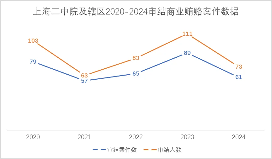 2025年12月,上海市第二中级人民法院发布《商业贿赂犯罪案件审判白皮书(2020-2024)》,统计出该院及其辖区法院在2020年至2024年,共审结商业贿赂犯罪案件351件,涉案被告人433人。其中,2020年审结79件103人,2021年审结57件63人,2022年审结65件83人,2023年审结89件111人,2024年审结61件73人。
